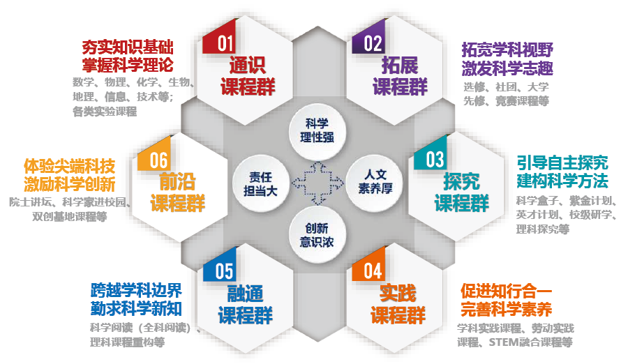 科學教育六大課程群相輔相成,形成“基礎普及-興趣激發-特長發展-創新突破”的進階鏈條,注重培育全體學生的科學觀念、科學思維、探究實踐、態度責任等核心素養,為拔尖創新人才的科學識別和持續發展提供多樣化、可選擇的課程支持。