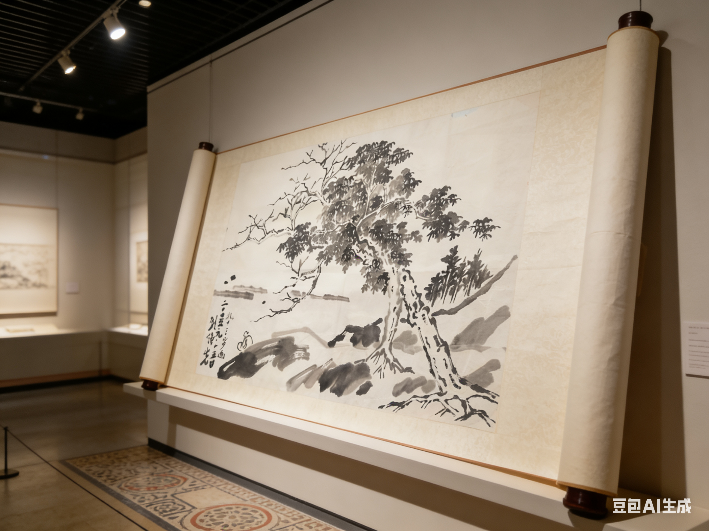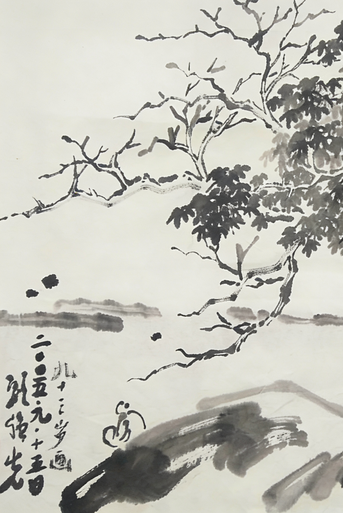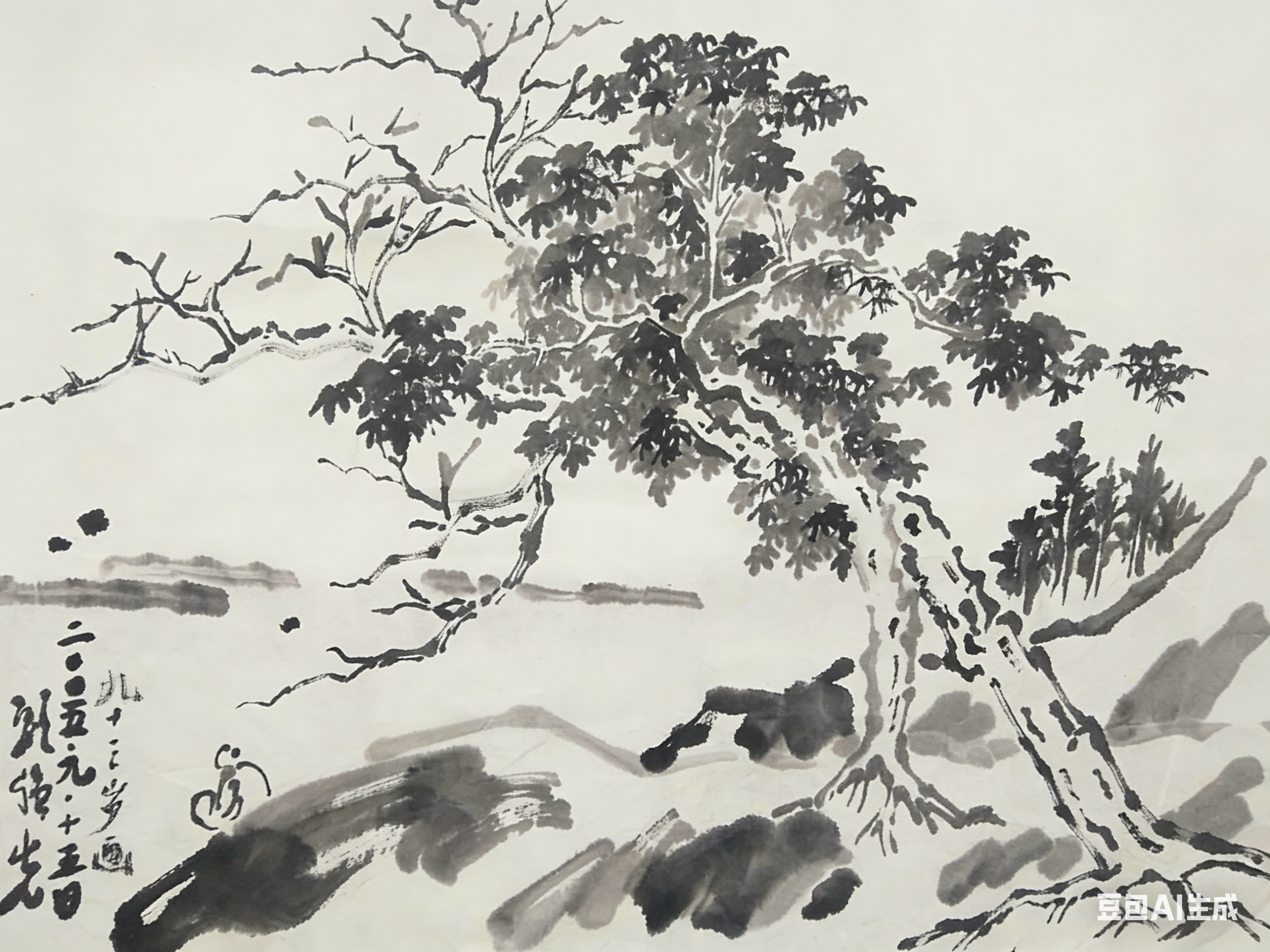 這幅絕筆裡,《世人》中「炊爨余閑筆一枝」的「頑癡」,化作筆墨骨力的底蘊。早年的顧強先,不懼世人不解,執著於傳統筆墨的研磨,這份「苦心」並非隨歲月消散,而是凝練為絕筆中每一根線條的韌性。畫中古樹的枝幹以枯筆焦墨寫就,篆籀筆意的線條乾澀卻力透紙背,扭轉頓挫間,是數十年「頑癡」鑽研皴法、筆意的沉澱;樹根盤結的灘石,僅以數筆簡化的斧劈皴勾勒,卻精準抓牢山石的質理,這是「苦心惟有玉樹知」的藝術執著,在生命終章的具象體現——那株蒼勁的古樹,便是他一生與筆墨相伴的精神寫照。