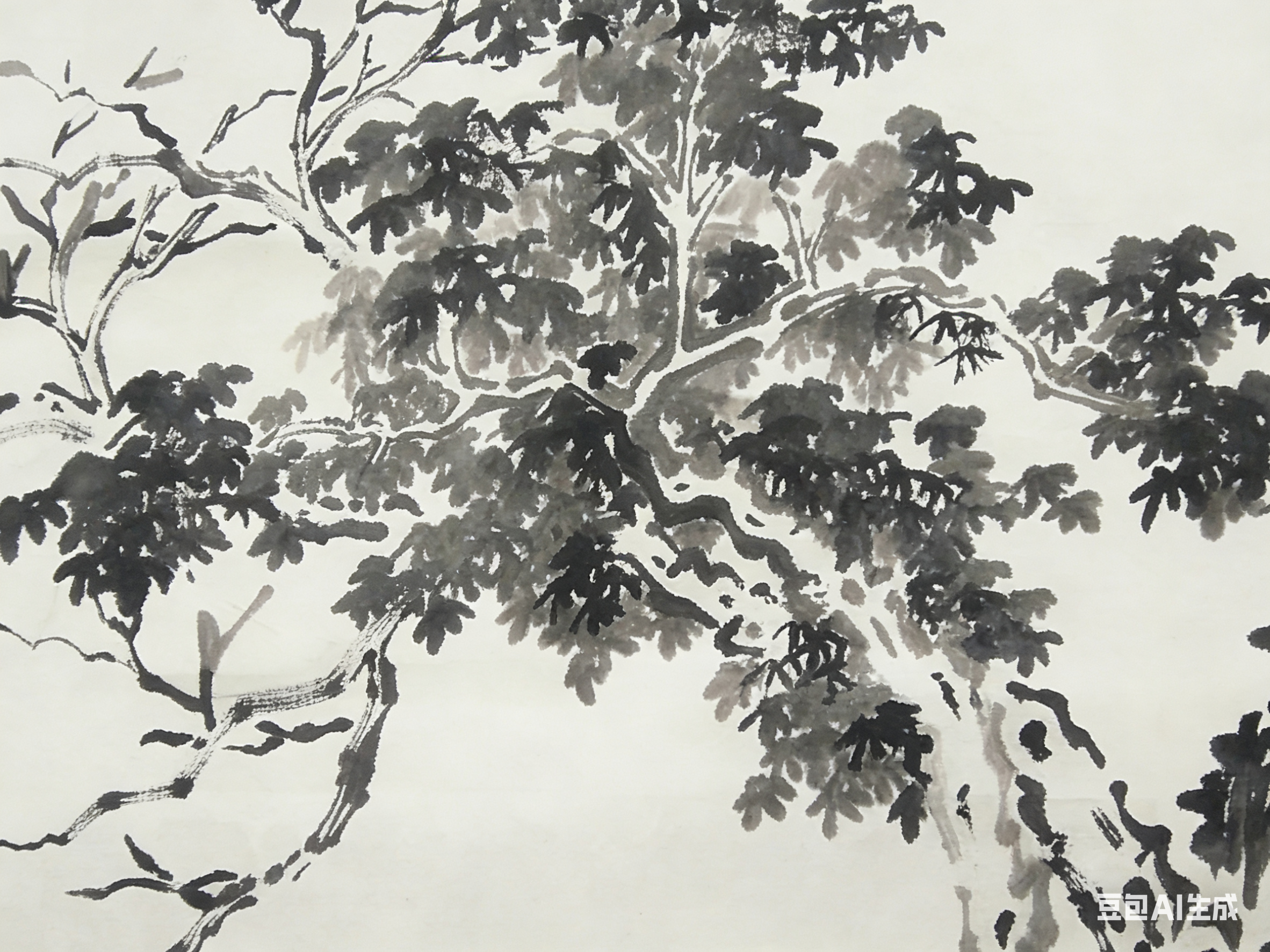 而《莫怪》中「丹青得意須毫縱」的主張,則成為絕筆之作的靈魂底色。九十三歲的顧強先,徹底擺脫了傳統技法的「繩規」束縛,以「除纓亦恥苦低眉」的傲骨揮灑筆墨。畫面構圖捨棄「三遠法」的刻板層次,僅以「一樹、一灘、一人」的簡素元素佈局,古樹居右斜出,人物臨溪閒立,遠水以留白鋪展,無半分刻意的章法安排,卻在虛實之間營造出蒼茫空寂的意境。樹冠的葉叢以大塊墨點隨意暈染,不執著於葉片的形似,只取蒼茂之神;臨溪人物僅以數筆淡墨勾出輪廓,卻活現出「清流濯足歸」的灑脫。這種「毫縱」,不是技法的放縱,而是筆墨與心境的高度合一,是藝術家跳脫形體束縛,直抒胸臆的終極表達。