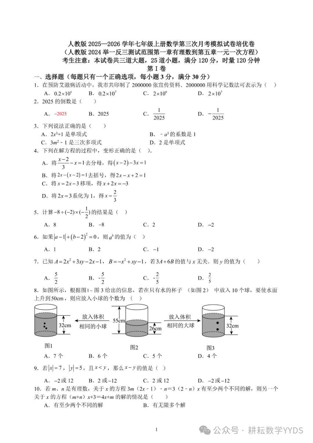 人教版25-26學年七年級上冊數(shù)學第三次月考培優(yōu)卷