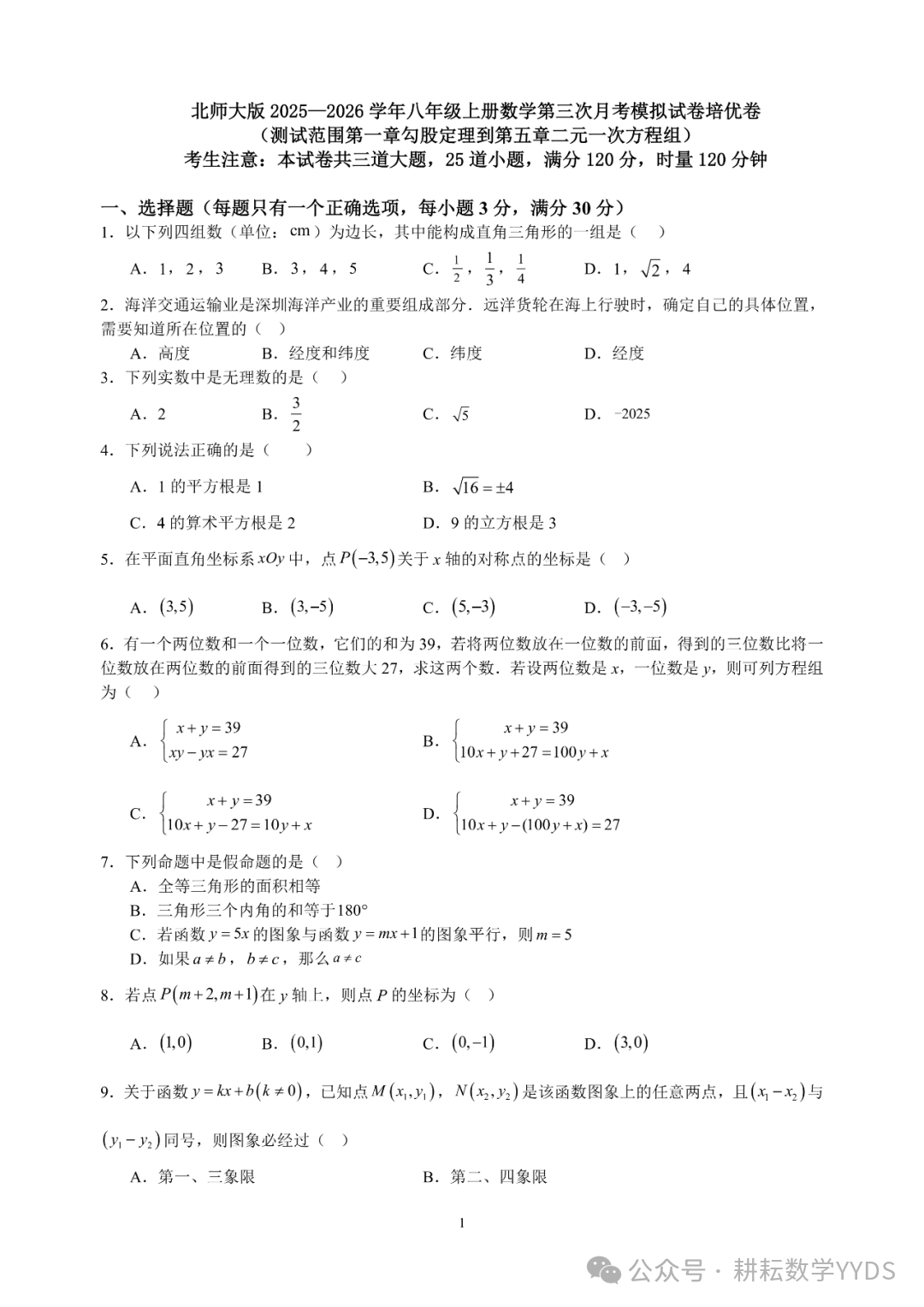 北師大版25-26學(xué)年八年級上學(xué)期數(shù)學(xué)第三次月考培優(yōu)卷