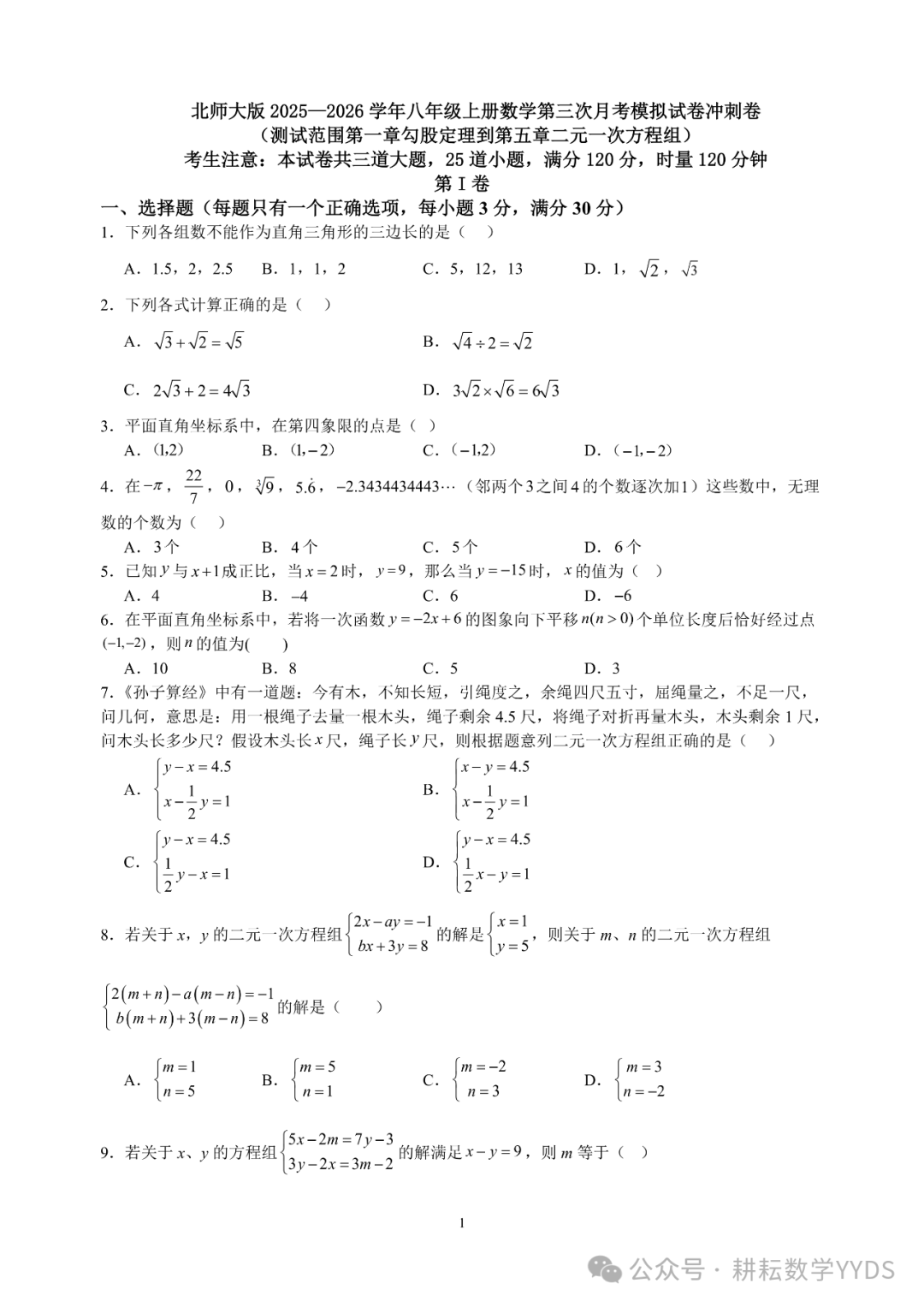 北師大版25-26學年八年級上冊數學第三次月考沖刺卷