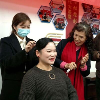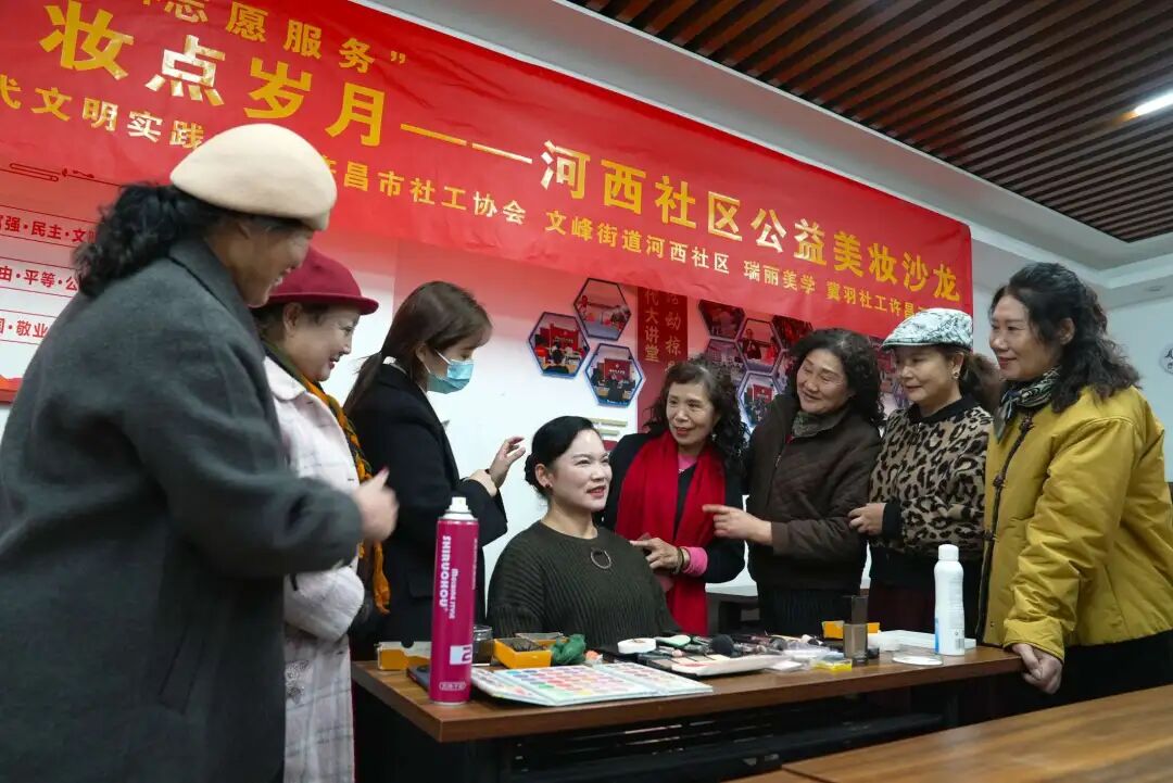 “阿姨,您平常自己涂粉底的時候,發際線部位別涂得太厚,否則妝容太假……”12月13日,魏都區文峰街道河西社區黨群服務中心二樓的大廳里,專業化妝師員靜左手拿著粉底膏,右手舉著粉擦,一邊給55歲的社區居民劉艷麗涂粉底,一邊講解化妝知識。