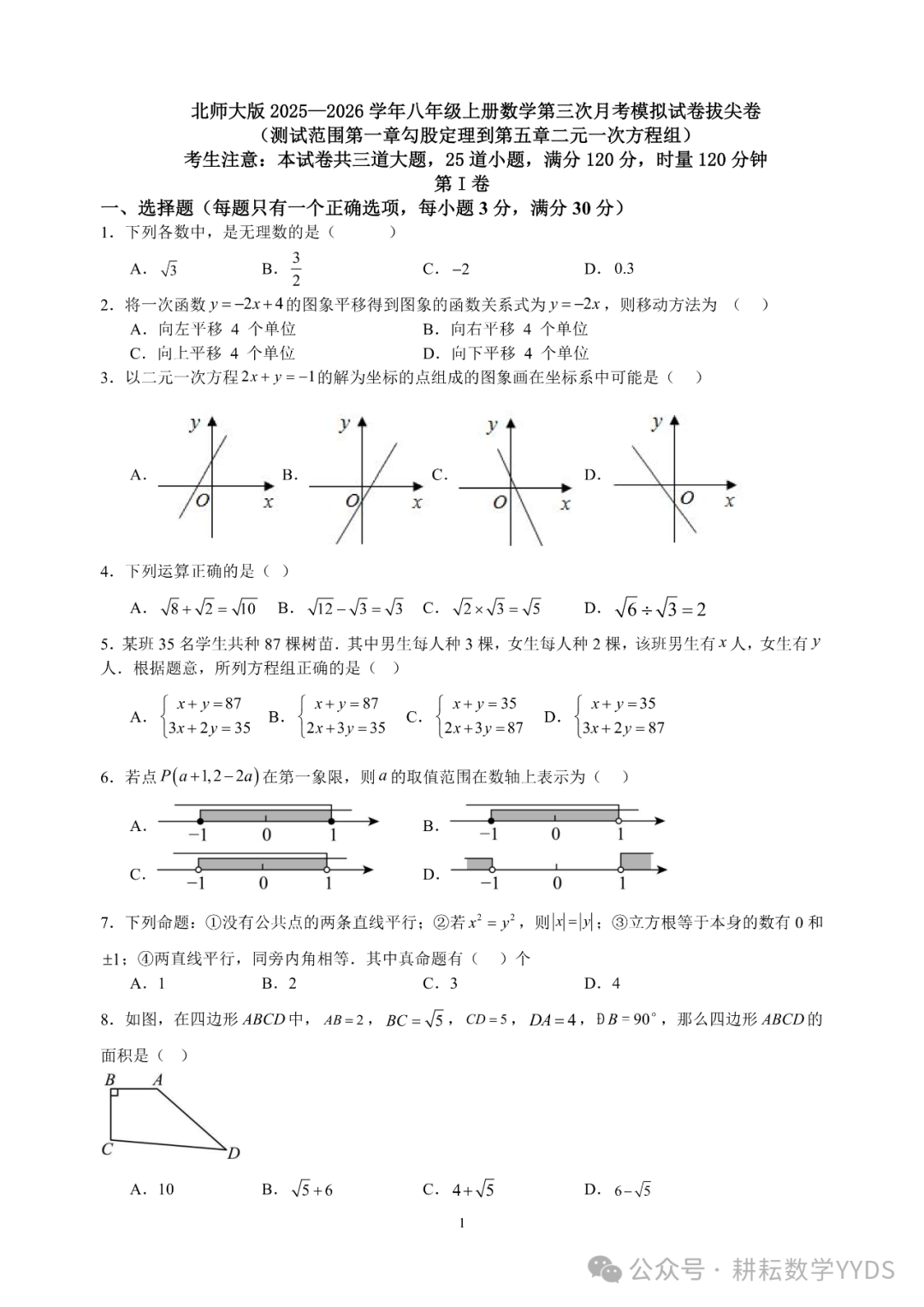 北師大版25-26學年八年級數學第三次月考拔尖卷