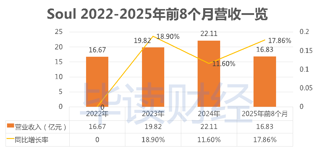 財務(wù)表現(xiàn)上,Soul確實在近年展現(xiàn)出一定的經(jīng)營韌性。根據(jù)公司最新遞交的港交所招股書,2022年公司營收為16.67億元,2023年增長至19.82億元,2024年進一步提升至22.11億元,三年復(fù)合年增長率約15.2%。2025年前8個月,Soul營收進一步增至16.83億元,同比增長兩位數(shù)達17.86%,增速高于過去三年平均水平。