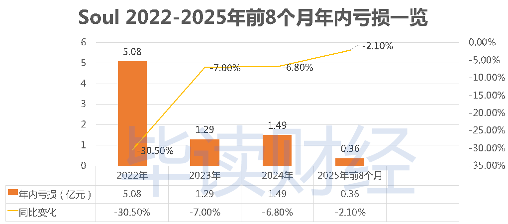 更值得注意的是,Soul自2023年起在經(jīng)調(diào)整凈利潤(非國際財務(wù)報告準則)口徑下首次實現(xiàn)盈利,2023年為3.61億元,2024年為3.37億元,2025年前8個月已達2.86億元。然而,在國際財務(wù)報告準則下,公司同期仍處于凈虧損狀態(tài),2022年、2023年、2024年及2025年前8個月的凈虧損分別為5.08億元、1.29億元、1.49億元和0.36億元,三年多以來,累計虧損8.22億元。