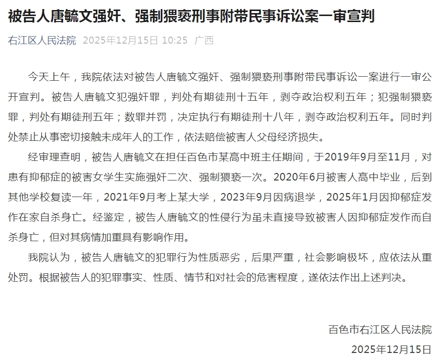 經(jīng)審理查明,被告人唐毓文在擔(dān)任百色市某高中班主任期間,于2019年9月至11月,對(duì)患有抑郁癥的被害女學(xué)生實(shí)施強(qiáng)奸二次、強(qiáng)制猥褻一次。2020年6月被害人高中畢業(yè),后到其他學(xué)校復(fù)讀一年,2021年9月考上某大學(xué),2023年9月因病退學(xué),2025年1月因抑郁癥發(fā)作在家自殺身亡。經(jīng)鑒定,被告人唐毓文的性侵行為雖未直接導(dǎo)致被害人因抑郁癥發(fā)作而自殺身亡,但對(duì)其病情加重具有影響作用。