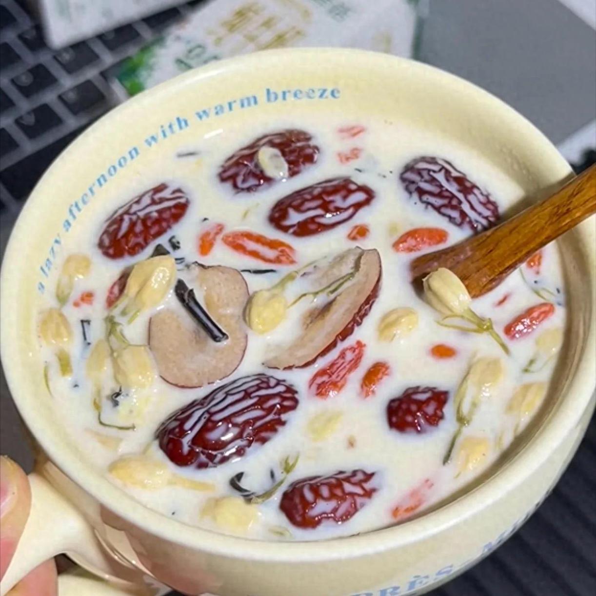 純牛奶200毫升、即食燕麥片50克、雞蛋2個、紅棗3顆、冰糖10克、白芝麻少許