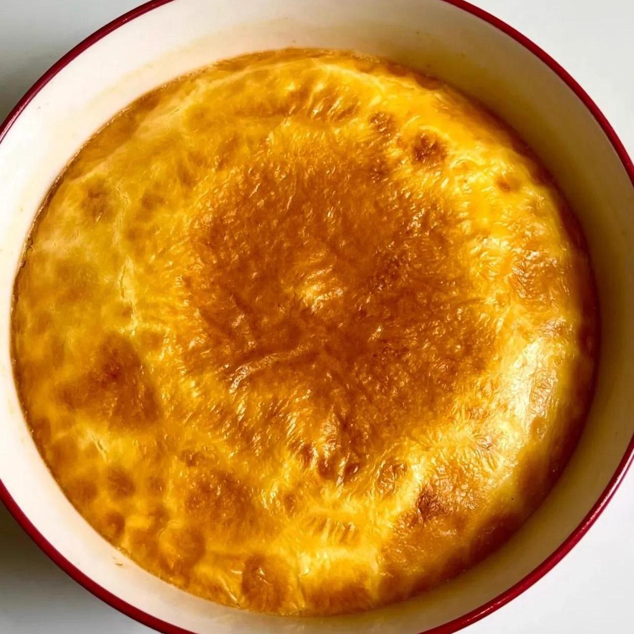 4、將混合好的牛奶倒入烤碗中,放入提前預熱好的烤箱中層,上下火180度烤15分鐘,至表面微微泛黃即可。
