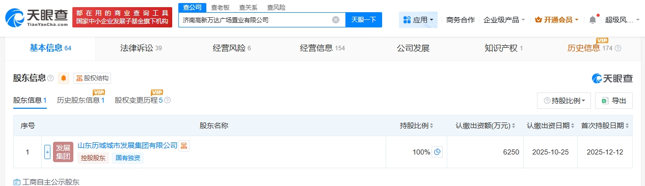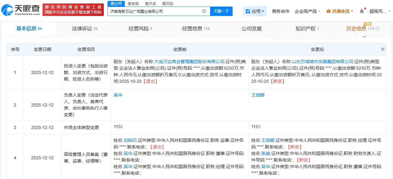 天眼查工商信息顯示,近日,濟南高新萬達廣場置業有限公司發生工商變更,大連萬達商業管理集團股份有限公司退出股東行列,新增山東歷城城市發展集團有限公司全資持股,同時該公司法定代表人及高管均發生變更…