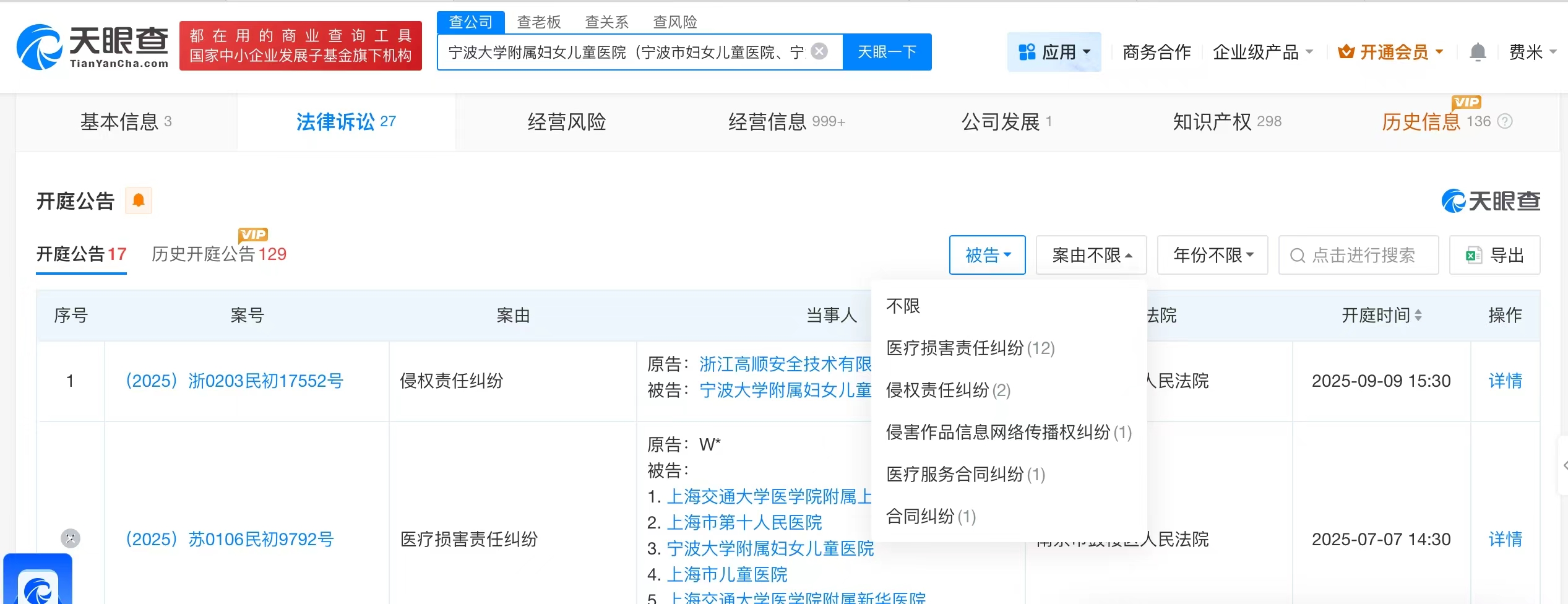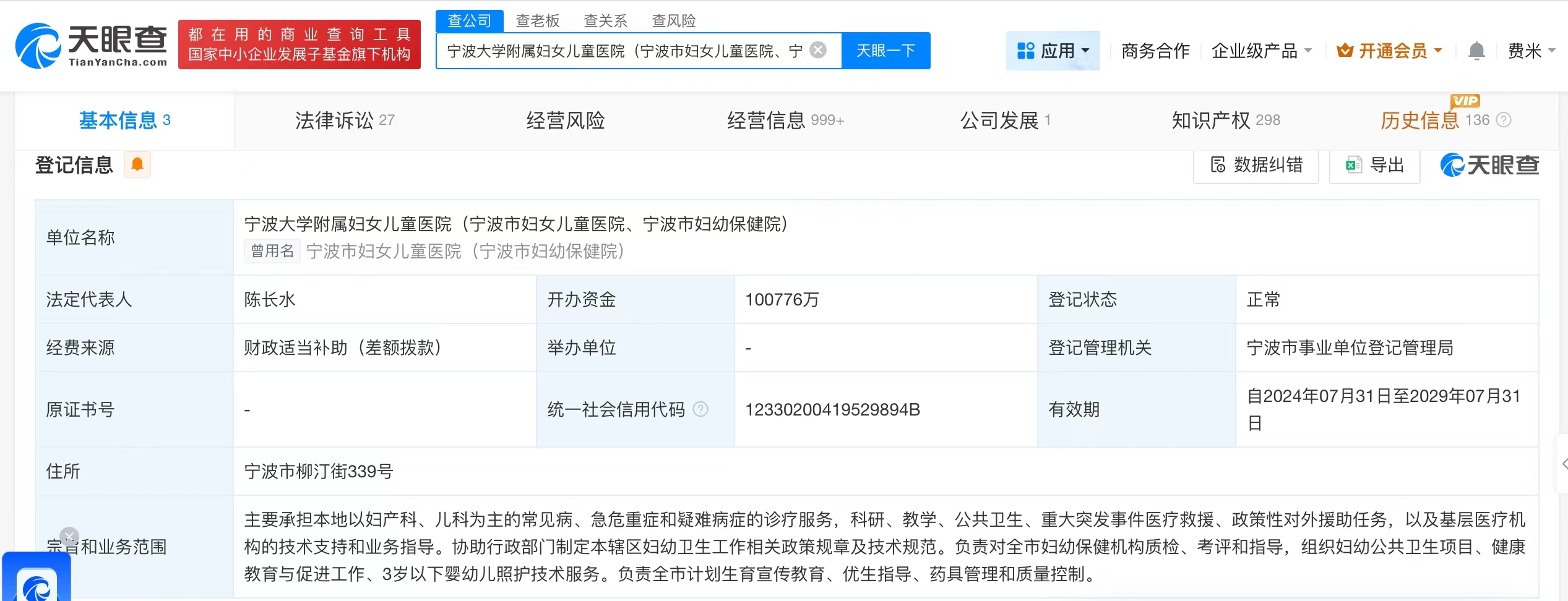 天眼查App顯示,涉事醫(yī)院寧波大學(xué)附屬婦女兒童醫(yī)院(寧波市婦女兒童醫(yī)院、寧波市婦幼保健院)法定代表人為陳長水,注冊(cè)資本約10.1億人民幣,經(jīng)營范圍包括主要承擔(dān)本地以婦產(chǎn)科、兒科為主的常見病、急危重癥和疑難病癥的診療服務(wù)等。法律訴訟信息顯示,該醫(yī)院曾多次因醫(yī)療損害責(zé)任糾紛、醫(yī)療服務(wù)合同糾紛等被起訴。