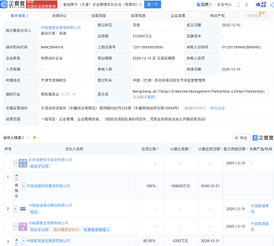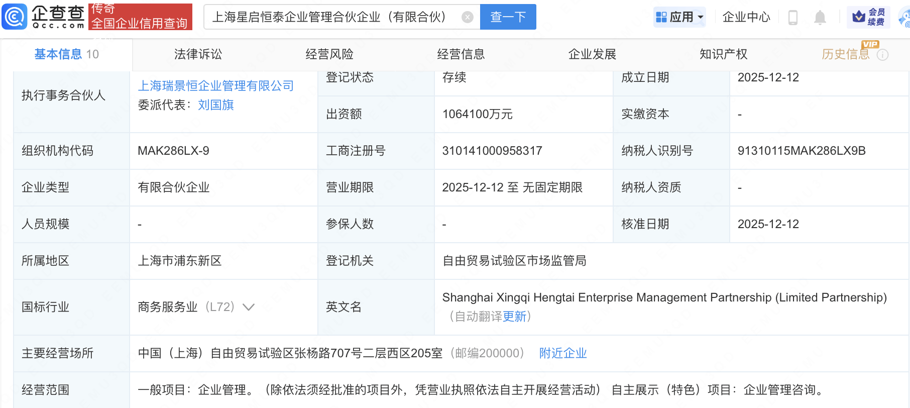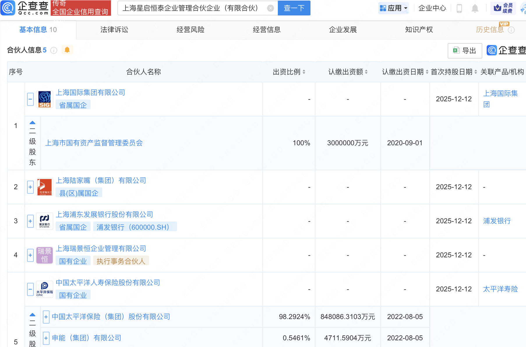 企查查APP顯示,近日,上海星啟恒泰企業管理合伙企業(有限合伙)成立,出資額106.41億元,經營范圍包含:企業管理;企業管理咨詢。企查查股權穿透顯示,該企業由上海國際集團有限公司、上海陸家嘴(集團)有限公司、浦發銀行(600000)、中國太保(601601)旗下中國太平洋人壽保險股份有限公司等共同出資。