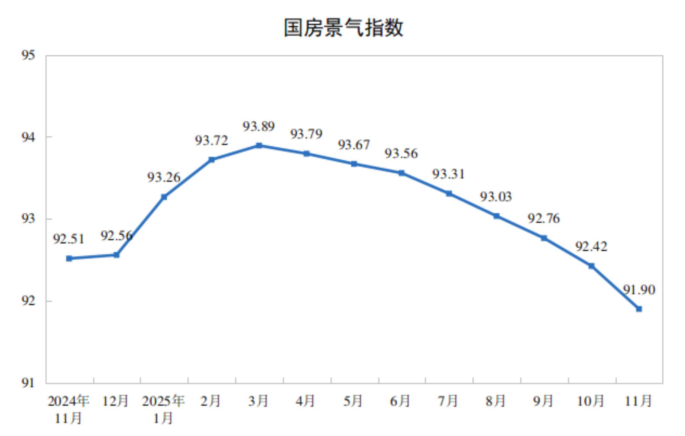 11月份,房地產(chǎn)開發(fā)景氣指數(shù)(簡稱“國房景氣指數(shù)”)為91.90。