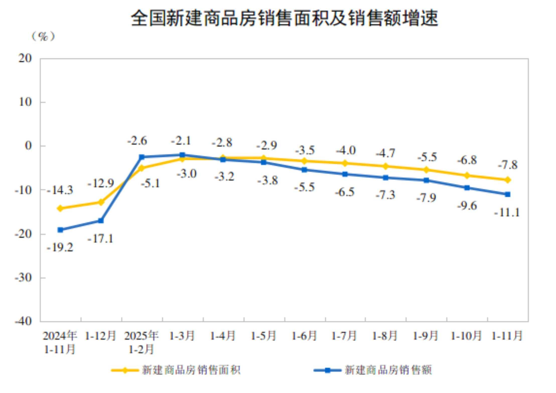 1—11月份,全國房地產(chǎn)開發(fā)投資78591億元,同比下降15.9%(按可比口徑計算,詳見附注6);其中,住宅投資60432億元,下降15.0%。