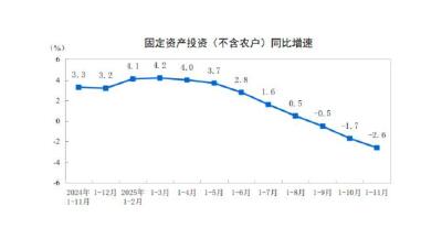 國家統計局數據顯示,2025年1—11月份,全國固定資產投資(不含農戶)444035億元,同比下降2.6%。其中,民間固定資產投資同比下降5.3%。從環比看,11月份固定資產投資(不含農戶)下降1.03%。