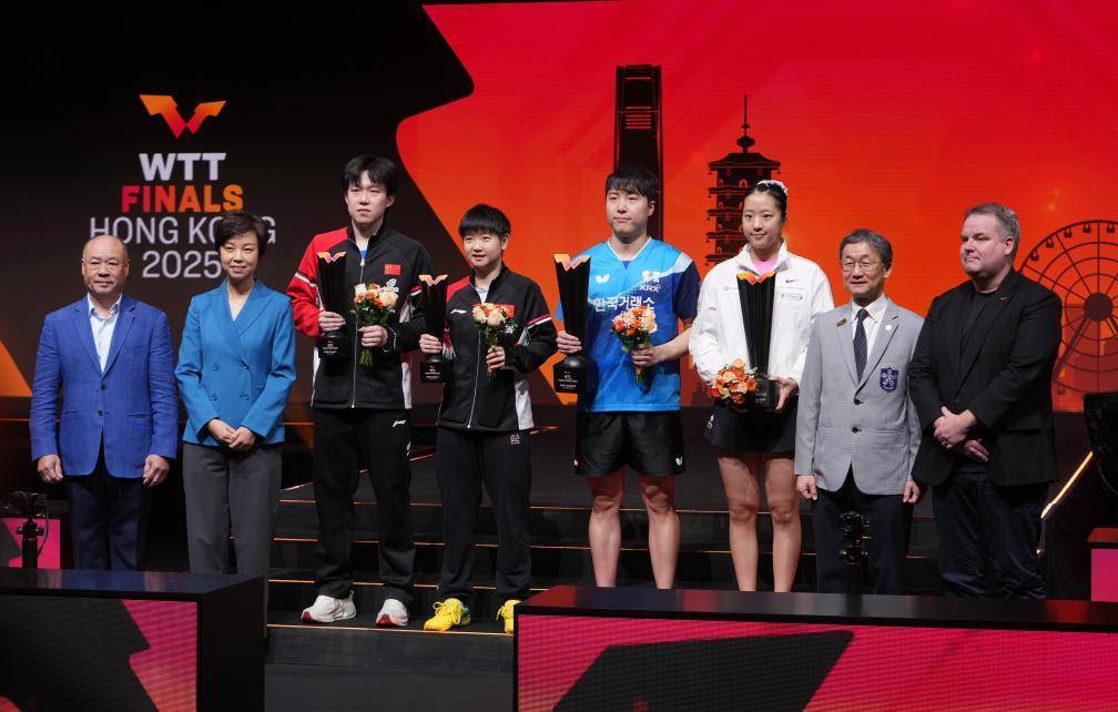 12月13日,冠軍韓國組合林鐘勛(右四)/申裕斌(右三)、亞軍中國組合王楚欽(左三)/孫穎莎(左四)和頒獎嘉賓在頒獎儀式