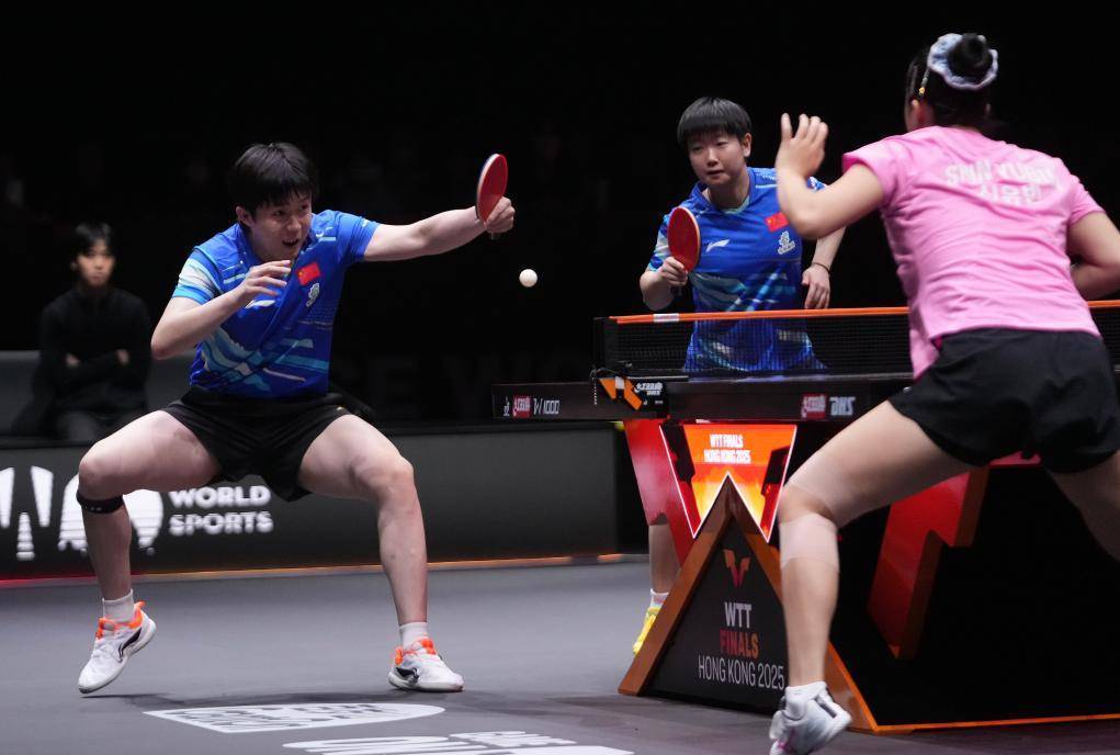 12月13日,王楚欽(左)/孫穎莎在混雙決賽中。新華社發(呂小煒攝)
