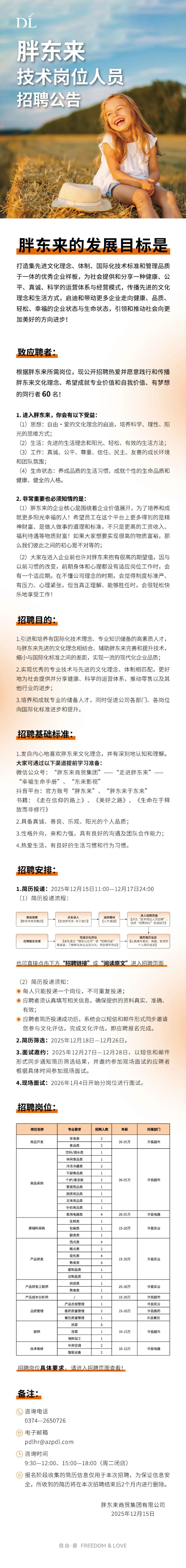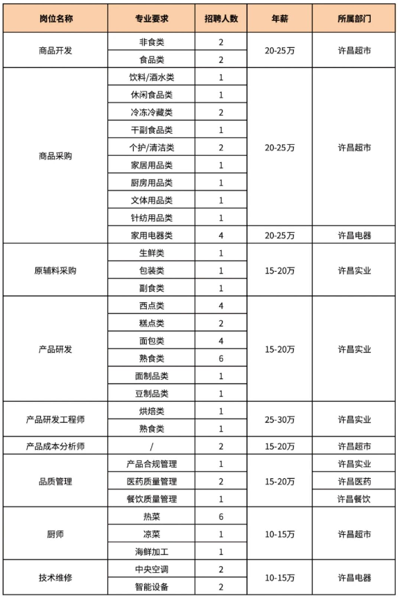 【大河財(cái)立方消息】12月15日,胖東來商貿(mào)集團(tuán)發(fā)布招聘公告,公開招聘60名技術(shù)崗位人員,涉及商品開發(fā)、商品采購、原輔料采購、產(chǎn)品研發(fā)、廚師等崗位,年薪最高30萬元。