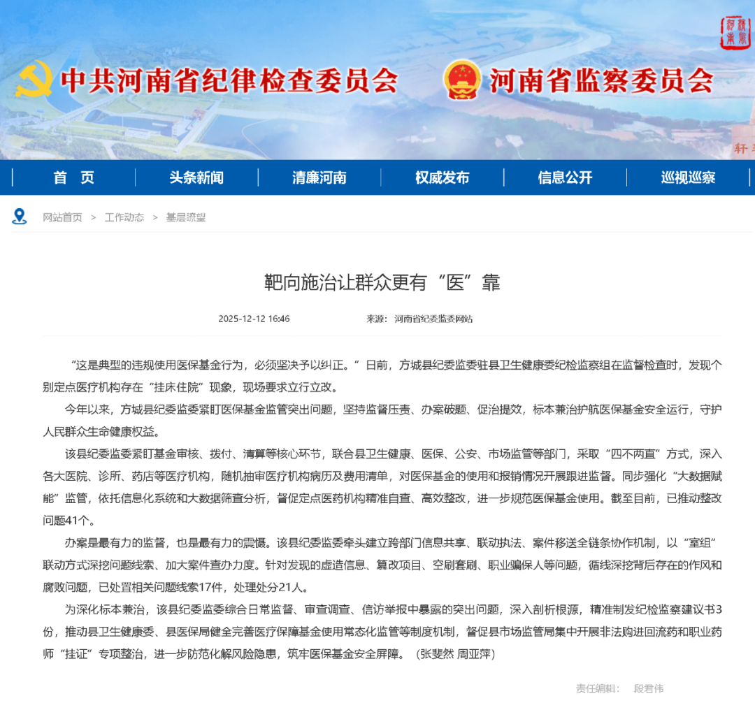 “這是典型的違規使用醫保基金行為,必須堅決予以糾正。”日前,方城縣紀委監委駐縣衛生健康委紀檢監察組在監督檢查時,發現個別定點醫療機構存在“掛床住院”現象,現場要求立行立改。