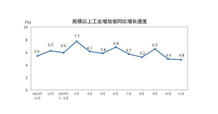 中新網12月15日電 據國家統計局網站消息,11月份,規模以上工業增加值同比實際增長4.8%(增加值增速均為扣除價格因素的實際增長率)。從環比看,11月份,規模以上工業增加值比上月增長0.44%。1—11月份,規模以上工業增加值同比增長6.0%。