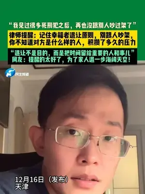 12月16日(發布)天津,“我見過很多死刑犯之后,再也沒跟別人吵過架了”律師提醒:記住幸福者退讓原則,別跟人吵架,你不知道對方是什么樣的人,積攢了多久的壓力“退讓不是目的,而是把時間留給重要的人和事兒”網友:提醒的太好了,為了家人退一步海闊天空!(@曹律聊心法 )