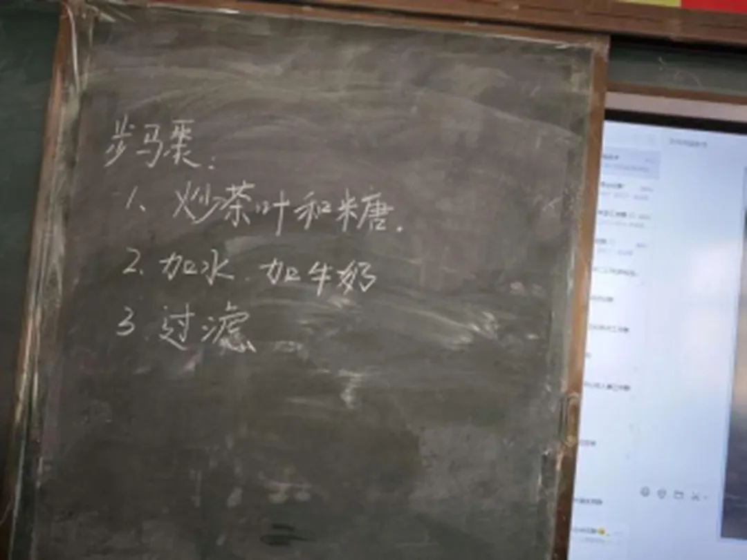 同學們擺放好各種材料,將茶葉輕輕撒入鍋中,伴隨著鍋鏟的翻動,茶葉漸漸散發出濃郁的清香。緊接著,加入新鮮的牛奶,孩子們輕柔地攪拌著,蒸煮著,剎那間教師里彌漫著奶茶的香甜氣息。煮好后,同學們用濾網將茶葉過濾掉,一杯杯清澈的奶茶就初步成型啦!