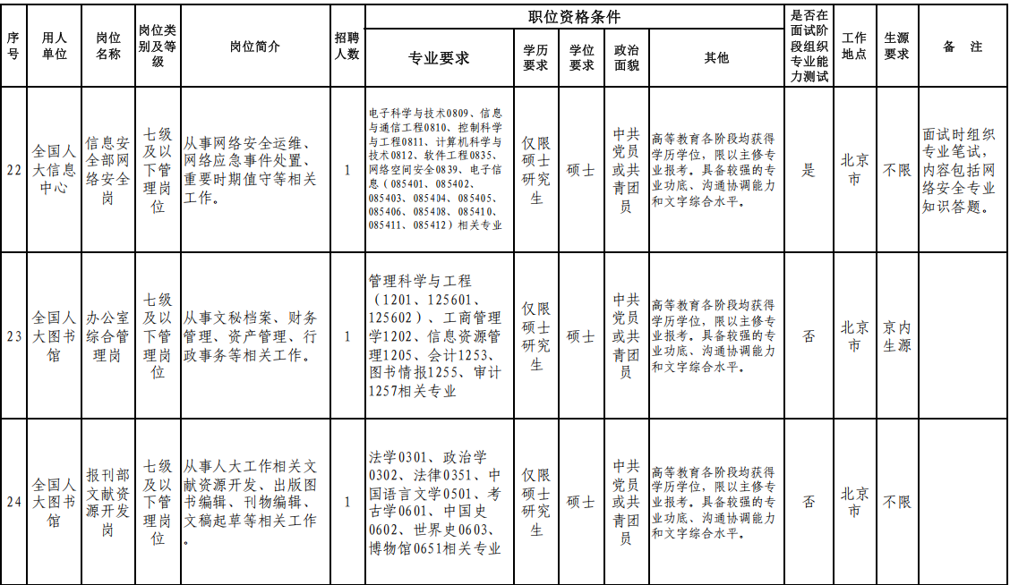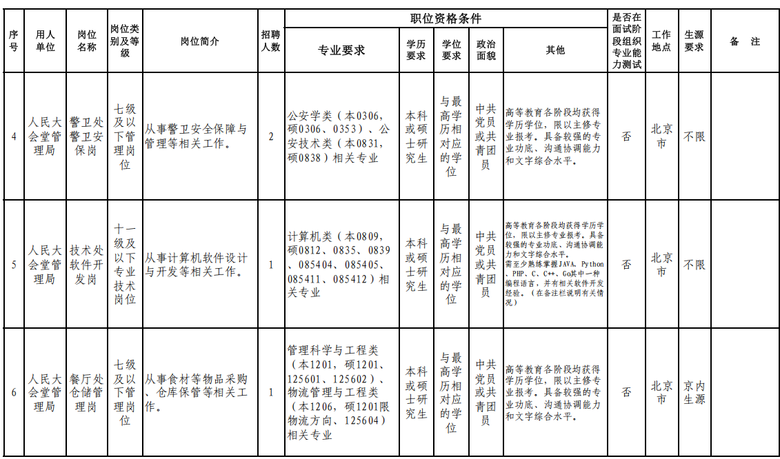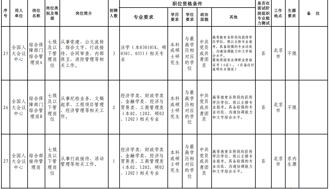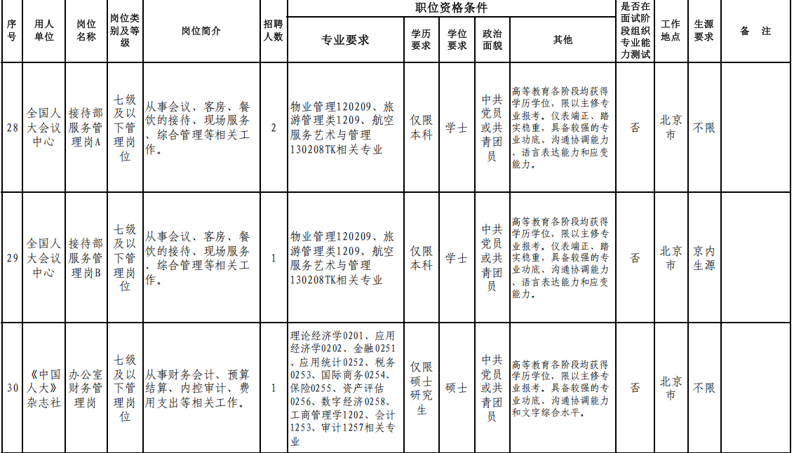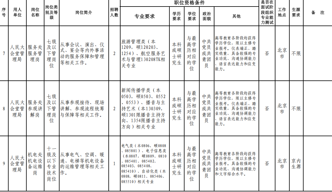 人民大會(huì)堂管理局、全國(guó)人大機(jī)關(guān)服務(wù)中心、全國(guó)人大培訓(xùn)中心、全國(guó)人大信息中心、全國(guó)人大圖書(shū)館等7家用人單位。