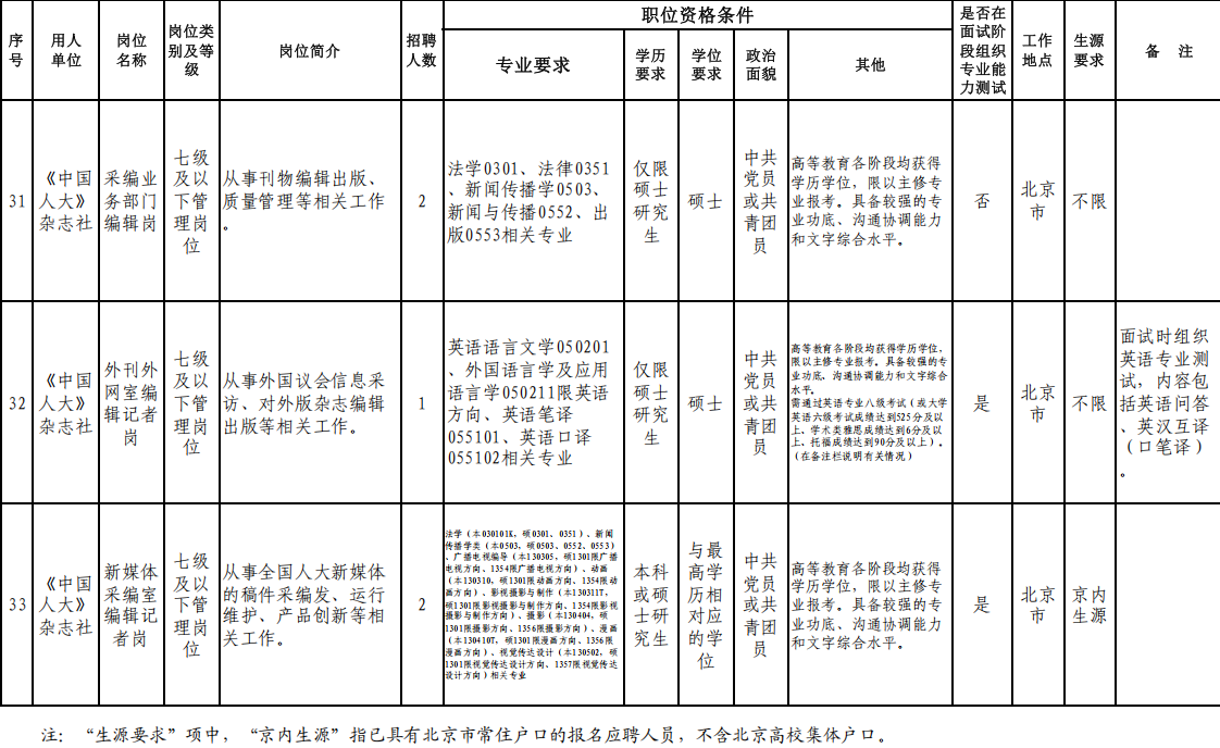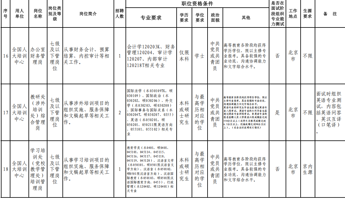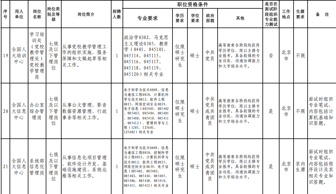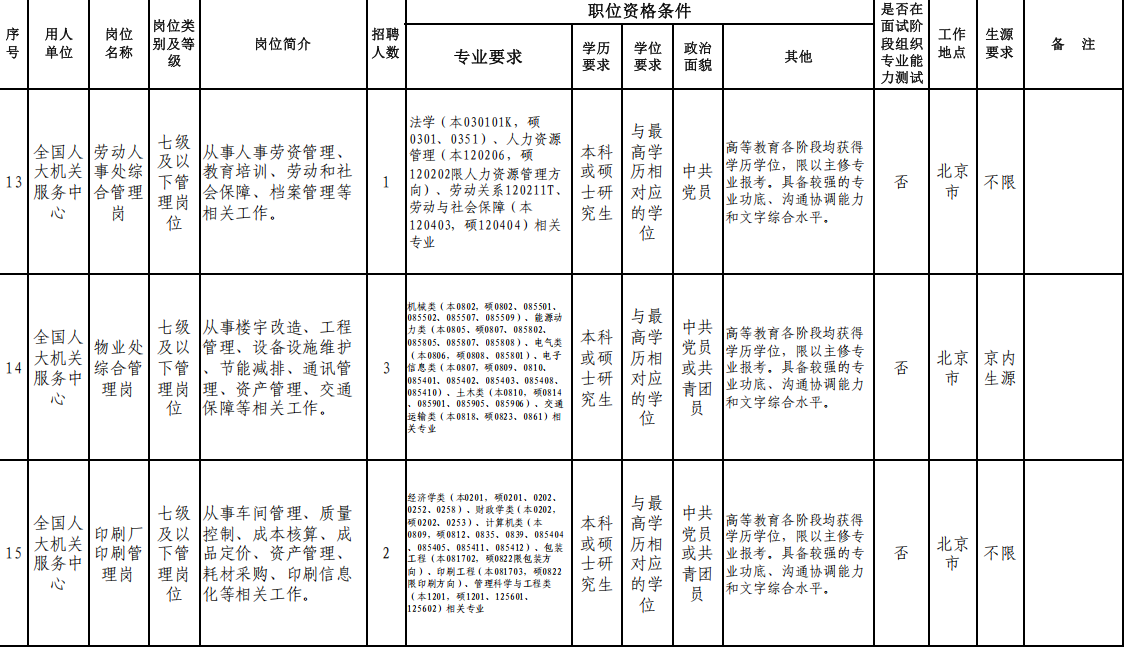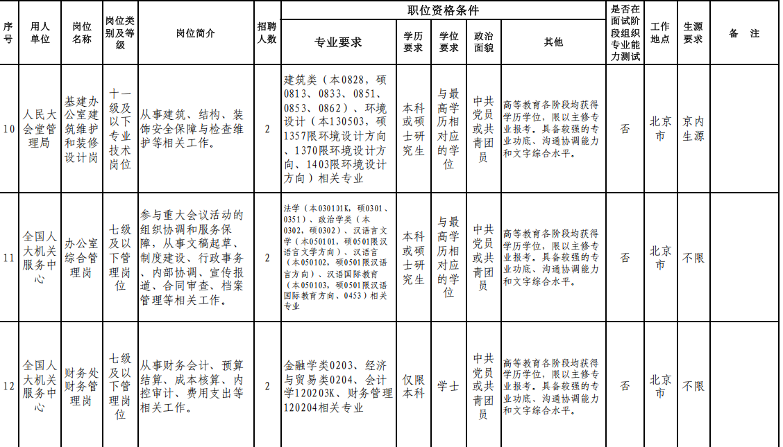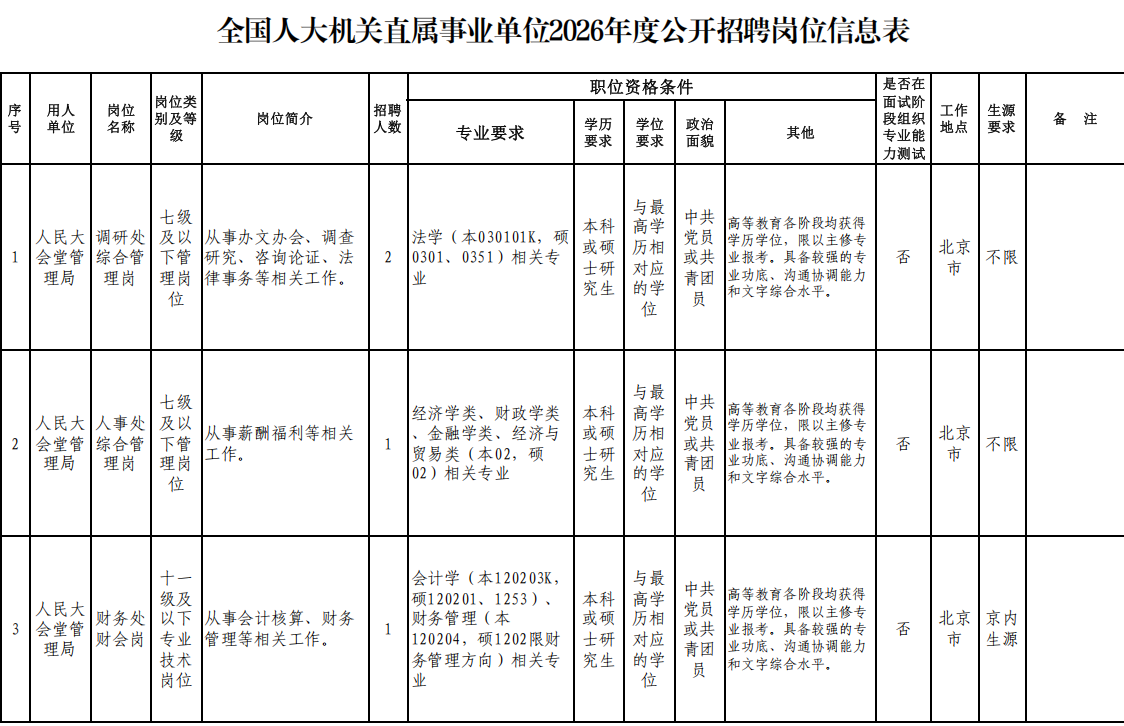 附:全國(guó)人大機(jī)關(guān)直屬事業(yè)單位2026年度公開(kāi)招聘崗位信息表