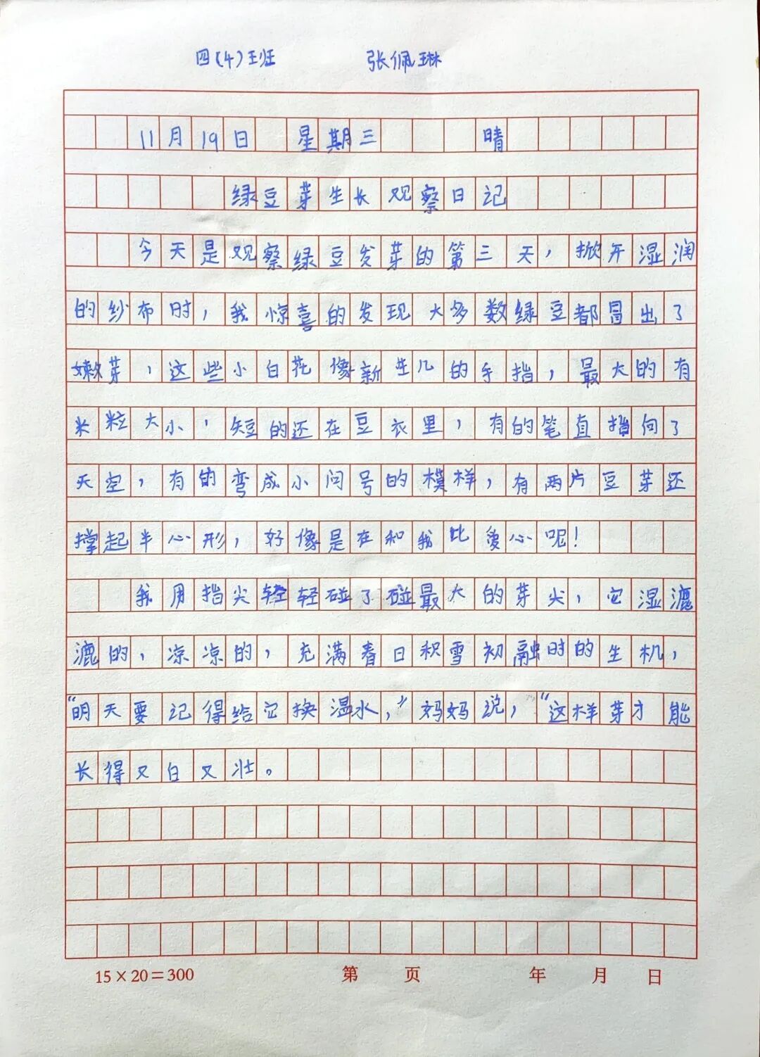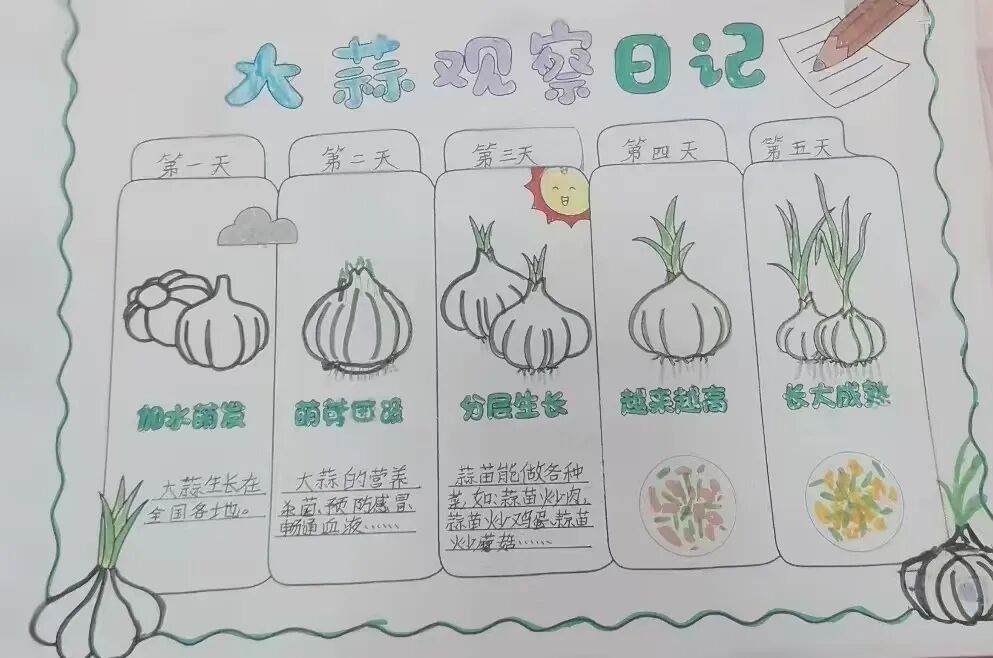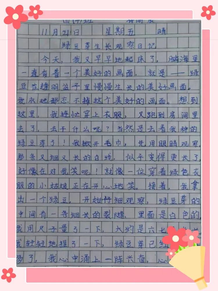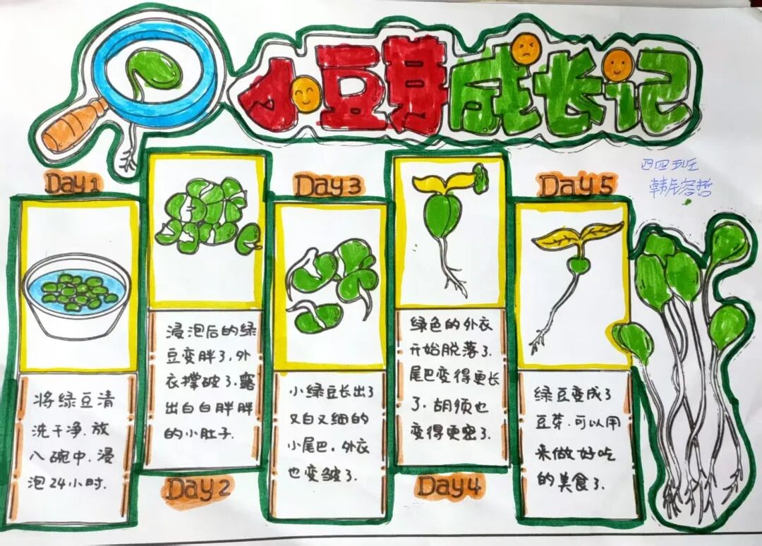 以“綠豆發(fā)芽記”為例:(學(xué)生根據(jù)自己的興趣點(diǎn),選擇了不同的觀察對(duì)象),一周過(guò)后,引導(dǎo)學(xué)生模仿課文的描述,根據(jù)觀察記錄表的記錄,嘗試形成觀察日記。