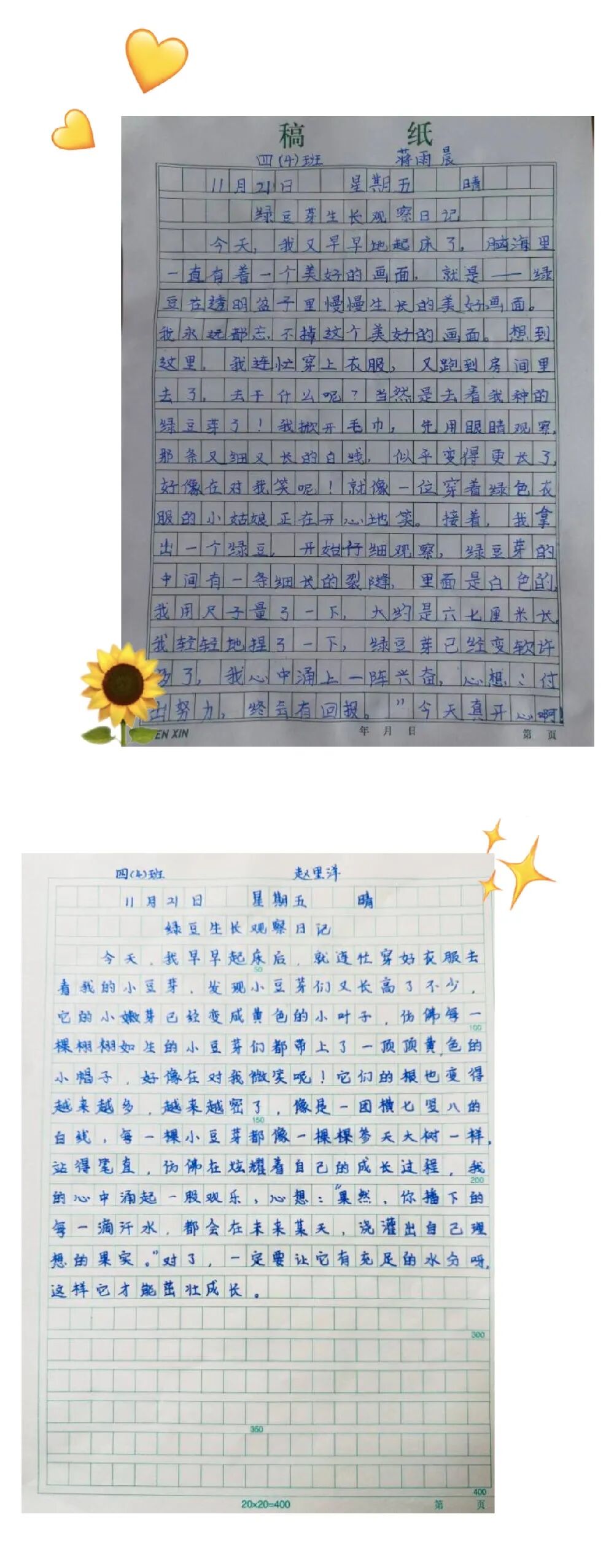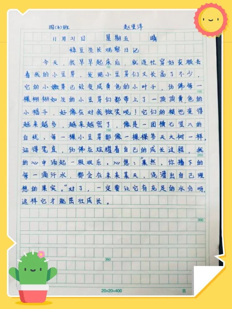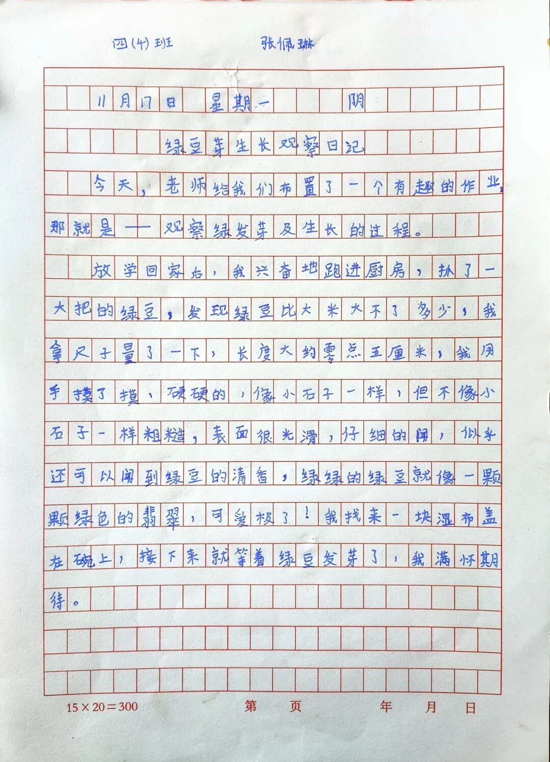 以“綠豆發(fā)芽記”為例:(學(xué)生根據(jù)自己的興趣點(diǎn),選擇了不同的觀察對(duì)象),一周過(guò)后,引導(dǎo)學(xué)生模仿課文的描述,根據(jù)觀察記錄表的記錄,嘗試形成觀察日記。
