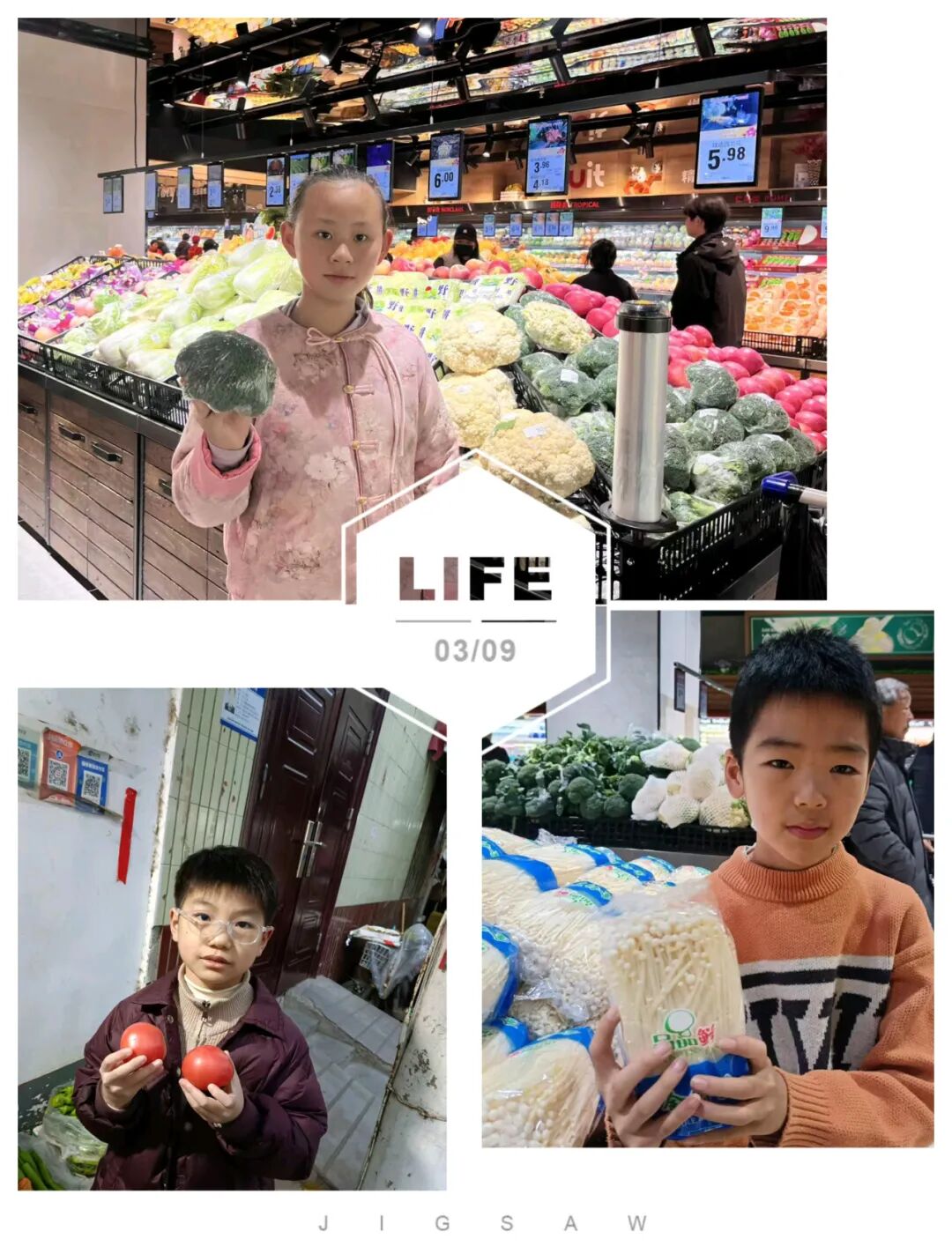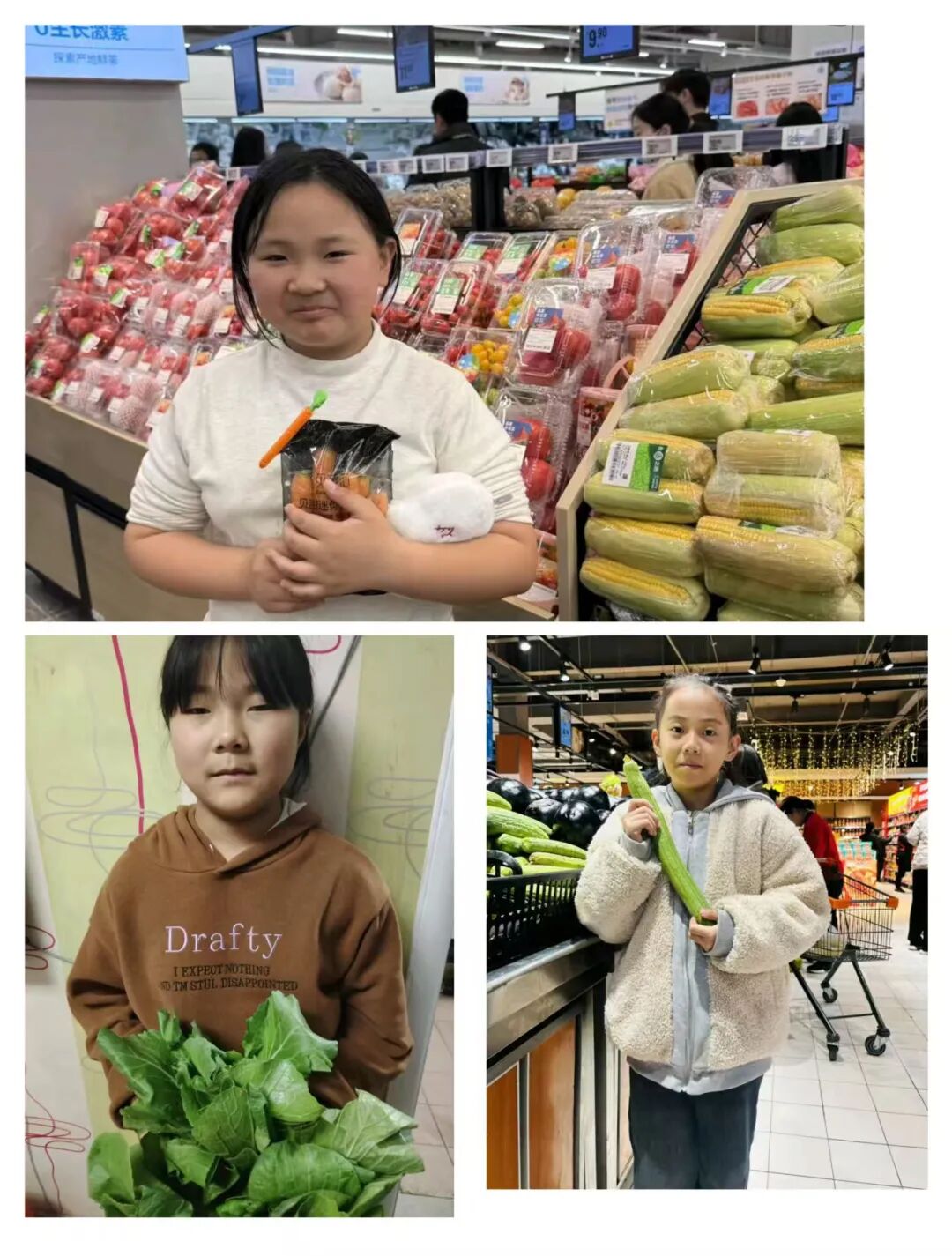 超市的蔬菜區(qū)里有各種各樣的蔬菜,有圓圓的茄子,長(zhǎng)長(zhǎng)的豆角,水嫩的黃瓜,紅紅的西紅柿,圓圓的土豆,綠綠的大白菜。我們認(rèn)真記錄著蔬菜的產(chǎn)地,蔬菜的顏色,蔬菜的形狀。瞧!那些辣椒紅的似火,黃的賽金......它們的產(chǎn)地也不一樣。