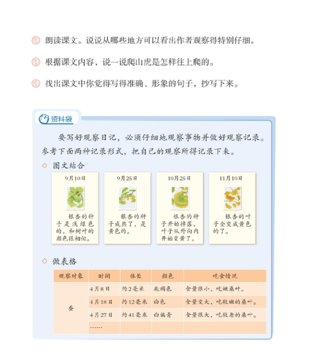 在觀察蔬菜前,我們提出以下問(wèn)題:1.怎樣觀察,才能做到細(xì)致?2.如何運(yùn)用準(zhǔn)確、恰當(dāng)、生動(dòng)的表達(dá),將自己連續(xù)的觀察記錄下來(lái)?在帶領(lǐng)學(xué)生精讀課文過(guò)程中,激發(fā)學(xué)生對(duì)周?chē)挛镞M(jìn)行連續(xù)觀察的興趣,喚醒學(xué)生的生活記憶,幫助學(xué)生打開(kāi)思路。同時(shí),選定項(xiàng)目主題,明確目的――觀察的重點(diǎn)是事物的變化。精讀課文的學(xué)習(xí)目的是:體會(huì)文章準(zhǔn)確生動(dòng)的表達(dá),感受作者連續(xù)細(xì)致的觀察,引導(dǎo)學(xué)生以日常生活中的動(dòng)物或植物為觀察對(duì)象,將課堂內(nèi)所學(xué)習(xí)的“連續(xù)、細(xì)致”觀察遷移到自己的生活與表達(dá)中。于是,我們提出了這次項(xiàng)目化學(xué)習(xí)的驅(qū)動(dòng)性問(wèn)題:“學(xué)習(xí)第三單元課文,了解爬山虎是怎么向上爬的秘密,看到蟋蟀筑巢的全過(guò)程。這些都是作家留心生活,認(rèn)真觀察所得。你們能不能成為一個(gè)細(xì)致的觀察員,試著連續(xù)觀察,用觀察日記記錄下你們的收獲呢?”在這個(gè)過(guò)程中教師向?qū)W生提供學(xué)習(xí)支架:學(xué)習(xí)資料袋的相關(guān)鏈接,讓學(xué)生了解觀察記錄表的不同樣式,圖文結(jié)合式、表格式。看懂記錄方法,并進(jìn)行交流。再對(duì)比著看,說(shuō)說(shuō)各自的優(yōu)點(diǎn)。從而引導(dǎo)學(xué)生舉一反三,從多角度觀察事物,發(fā)現(xiàn)事物的變化、特點(diǎn),細(xì)致地記錄變化過(guò)程。