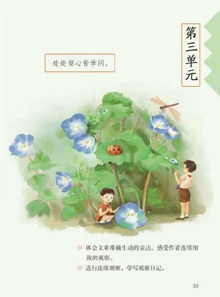 四年級(jí)第一學(xué)期語(yǔ)文第三單元的核心要素是學(xué)會(huì)連續(xù)觀察,并能夠?qū)懹^察日記,要求學(xué)生學(xué)習(xí)用觀察日記的形式記錄觀察對(duì)象的變化,把觀察的過(guò)程寫(xiě)下來(lái)。這與《新課標(biāo)》第二學(xué)段要求“觀察周?chē)澜纾懿痪行问降貙?xiě)下自己的見(jiàn)聞、感受和想象,注意把自己覺(jué)得新奇有趣或印象最深、最受感動(dòng)的內(nèi)容寫(xiě)清楚”的目標(biāo)契合。在以前的學(xué)習(xí)中,學(xué)生一方面已經(jīng)了解了日記的一般格式,初步養(yǎng)成了寫(xiě)日記的習(xí)慣;另一方面,知道要仔細(xì)觀察注意事物的變化,把觀察到的事物寫(xiě)清楚,這些都為本次習(xí)作奠定了基礎(chǔ)。因此,四年級(jí)組從這一單元入手展開(kāi)項(xiàng)目化學(xué)習(xí)。