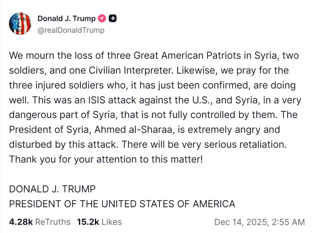 當地時間 12 月 13 日的敘利亞巴爾米拉市附近,原本是一場常規的聯合反恐巡邏,卻在瞬間變成了美軍的 “死亡陷阱”。一支美軍巡邏隊正和敘利亞地方安全力量協同推進 “反恐和穩定任務”,突然響起的槍聲打破了沙漠腹地的寧靜,兩名美軍士兵和一名美國翻譯當場倒在血泊中,三名美軍士兵和兩名敘利亞安全人員也不同程度受傷。最具諷刺意味的是,這場襲擊的制造者并非美軍口中的 “伊斯蘭國” 恐怖分子,而是和他們并肩執行任務的一名敘利亞安全部隊普通成員,這個事實讓整場反恐行動徹底變了味,也讓 “美軍命喪敘利亞到底誰該背鍋” 的爭議迅速發酵,而美國總統特朗普和國防部長赫格塞斯隨后的強硬表態,看似是雷霆威懾,實則是掩蓋尷尬的無奈之舉。