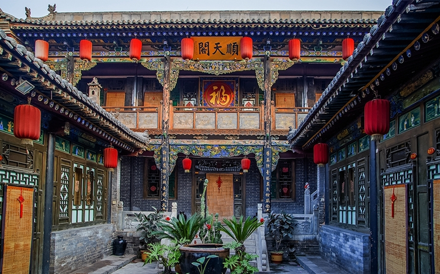 步入城內,一座龐大而精密的宇宙模型在腳下鋪展。以市樓為軸心,以南大街為脊梁,城池嚴格遵循“左城隍、右衙署,左文廟、右武廟,東道觀、西寺廟”的封建禮制格局。2.25平方公里的空間里,“四大街、八小巷、七十二條蚰蜒巷”如同血脈經絡,交織成一張巨大的“土”字形八卦圖。南大街、東大街、西大街、衙門街與城隍廟街,更以“干”字型撐起古城的商業骨架。行走其間,仿佛踏入一部凝固的明清城市史詩:沿街店鋪鋪面高大堅實,檐下彩繪斑斕,梁枋木雕繁復;鋪面之后,則是鱗次櫛比的青磚灰瓦四合院,深宅大院層層遞進,軸線分明,主從有序。最令人稱奇的是“房子半邊蓋”的獨特景觀——單坡屋頂一律向內傾斜,形成“四水歸堂”之勢。這不僅是山西干旱風沙環境下抵御風沙、保障安全的智慧結晶,更是“肥水不流外人田”的農耕文化心理與“對外排斥,對內凝聚”的家族倫理在建筑上的絕妙投射。每一扇精雕細琢的窗欞,每一塊寓意吉祥的磚雕,每一幅鄉土氣息濃郁的剪紙窗花,都在訴說著一個民族對家園的眷戀與守護。