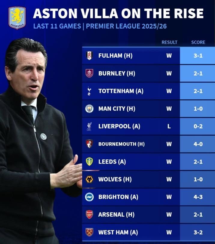 本場比賽過后,維拉繼續改寫著隊史紀錄。各項賽事9連勝,近11場英超聯賽,狂攬10場勝利,隊史首次取得英超6連勝,本賽季主場保持全勝。這些紀錄的背后,是滾燙的含金量。在這波瘋狂的搶分潮中,維拉擊敗的對手名單堪稱豪華,熱刺、曼城、阿森納,超爭冠集團中的三支頂級強隊,先后倒在了維拉公園球場。唯一的一場失利,是客場1球小負于衛冕冠軍的利物浦。如今的維拉,在埃梅里的調教下不僅能在弱旅身上穩定拿分,更具備了與最強對手硬碰硬并戰而勝之的“巨人殺手”實力。