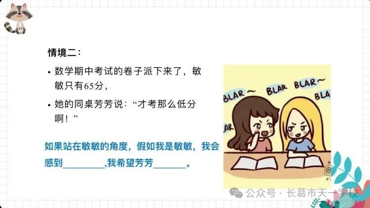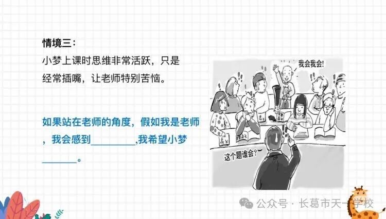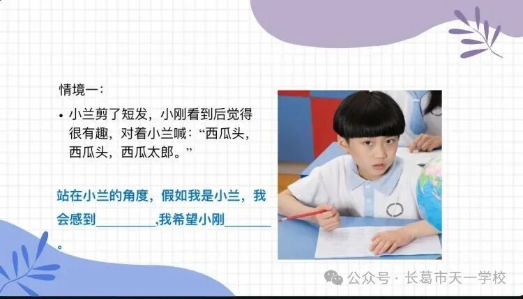情境探究環節成為課堂的“共情訓練場”。當“小剛嘲笑小蘭的西瓜頭”“小芳嘲笑敏敏考了低分”“小夢上課插嘴”的情境通過呈現,學生們迅速以4人小組為單位展開討論。隨后的分享中,學生們將“傷心”“難過”“內疚”的情緒貼紙貼在對應角色旁,原本單一的事件,在多角度解讀下變得立體鮮活。在同學的分享,道出了“換位思考”的初體驗。