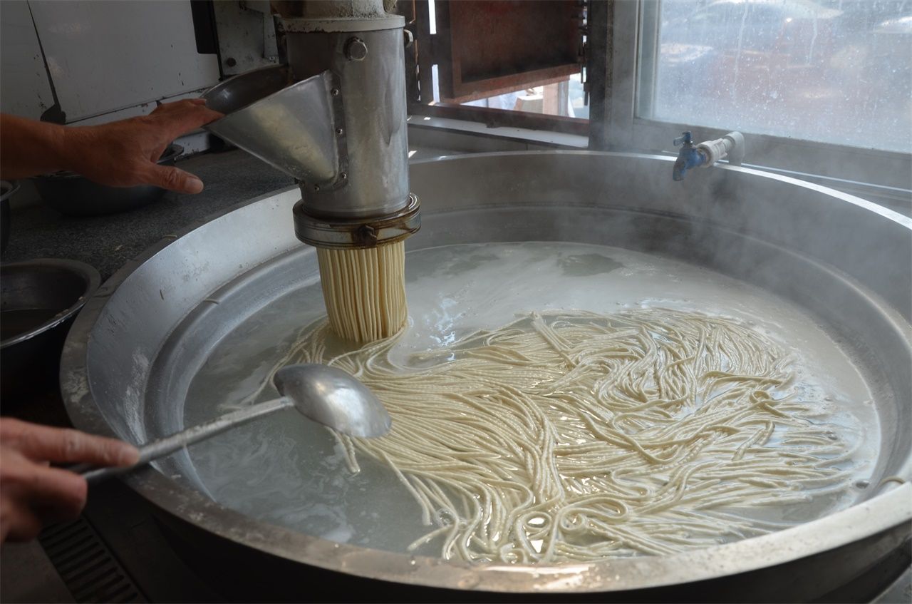 面條的制作是饸饹面的靈魂所在。選用符合GB/T 8607標準的高筋小麥粉,根據季節變化調整面粉與水的比例,夏季天熱水分稍減,冬季寒冷則適量增加,確保面團在不同溫度下都能達到表面細膩、光滑不粘手的狀態。老師傅們揉面時講究“三揉三醒”,每一次揉搓都要力道均勻,讓面筋充分延展,每一次醒發都要把握好時間,讓面團在靜置中積蓄韌性。將醒好的面團放入饸饹床的漏斗中,啟動機器或用力按壓壓桿,一根根圓潤潔白的面條便如銀線般“呲溜”滑入沸騰的鍋中,只需三分鐘左右,面條便煮熟撈出,根根分明、互不粘連,入口爽滑筋道,咀嚼間帶著小麥的天然醇香,即便是在滾燙的湯中浸泡許久,也不會軟爛,這便是郟縣饸饹面獨有的“勁道”。