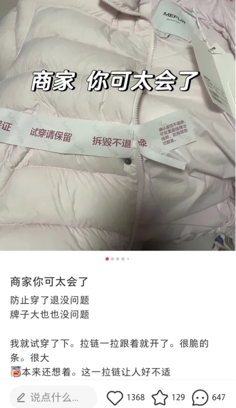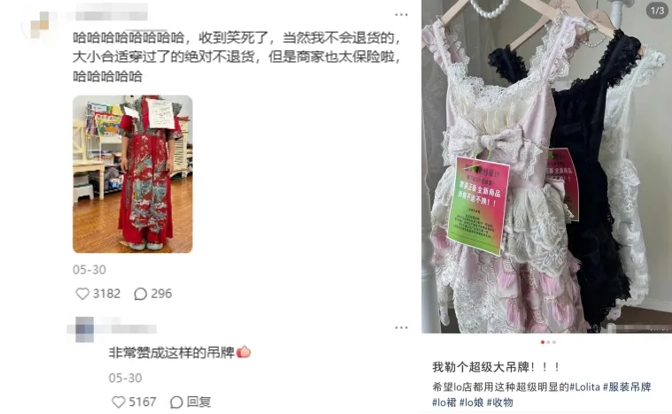 巨型吊牌奪人眼球,固然能夠在一定程度上減少蹭穿拍照的行為,然而更多的情況,或許是正常購買的消費者收貨后看到吊牌啼笑皆非,在網上曬出來帶來一波流量——雖說可以起到幫商家隔空喊話、宣泄情緒的作用,但于事無補。