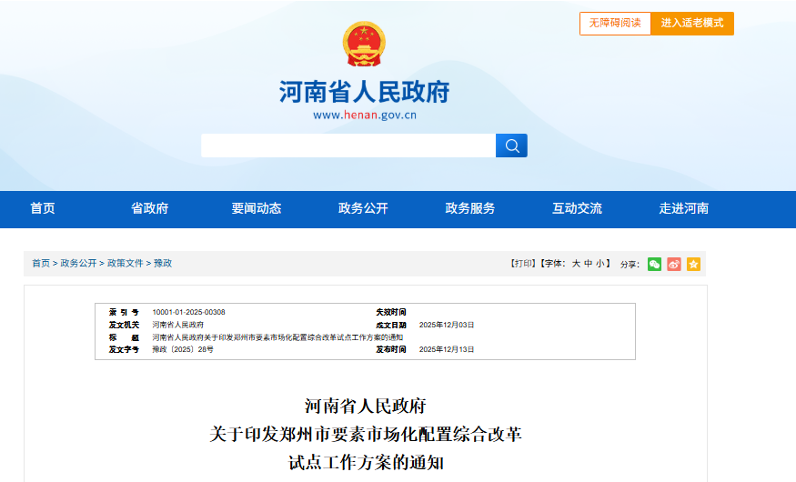 為落實國家部署,河南省人民政府發布《關于印發鄭州市要素市場化配置綜合改革試點工作方案的通知》,破除阻礙要素自由流動和高效配置的體制機制障礙,探索形成一批可復制可推廣的制度性創新成果。