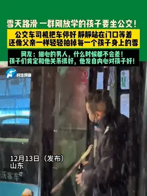12月13日(發(fā)布)山東,雪天路滑 一群剛放學(xué)的孩子要坐公交!公交車司機(jī)把車停好 靜靜站在門口等著還像父親一樣輕輕拍掉每一個孩子身上的雪 網(wǎng)友:細(xì)心的男人,什么時候都不會差!孩子們肯定和他關(guān)系很好,他發(fā)自內(nèi)心對孩子好!(@我是瑪尼女裝店的大菲 )