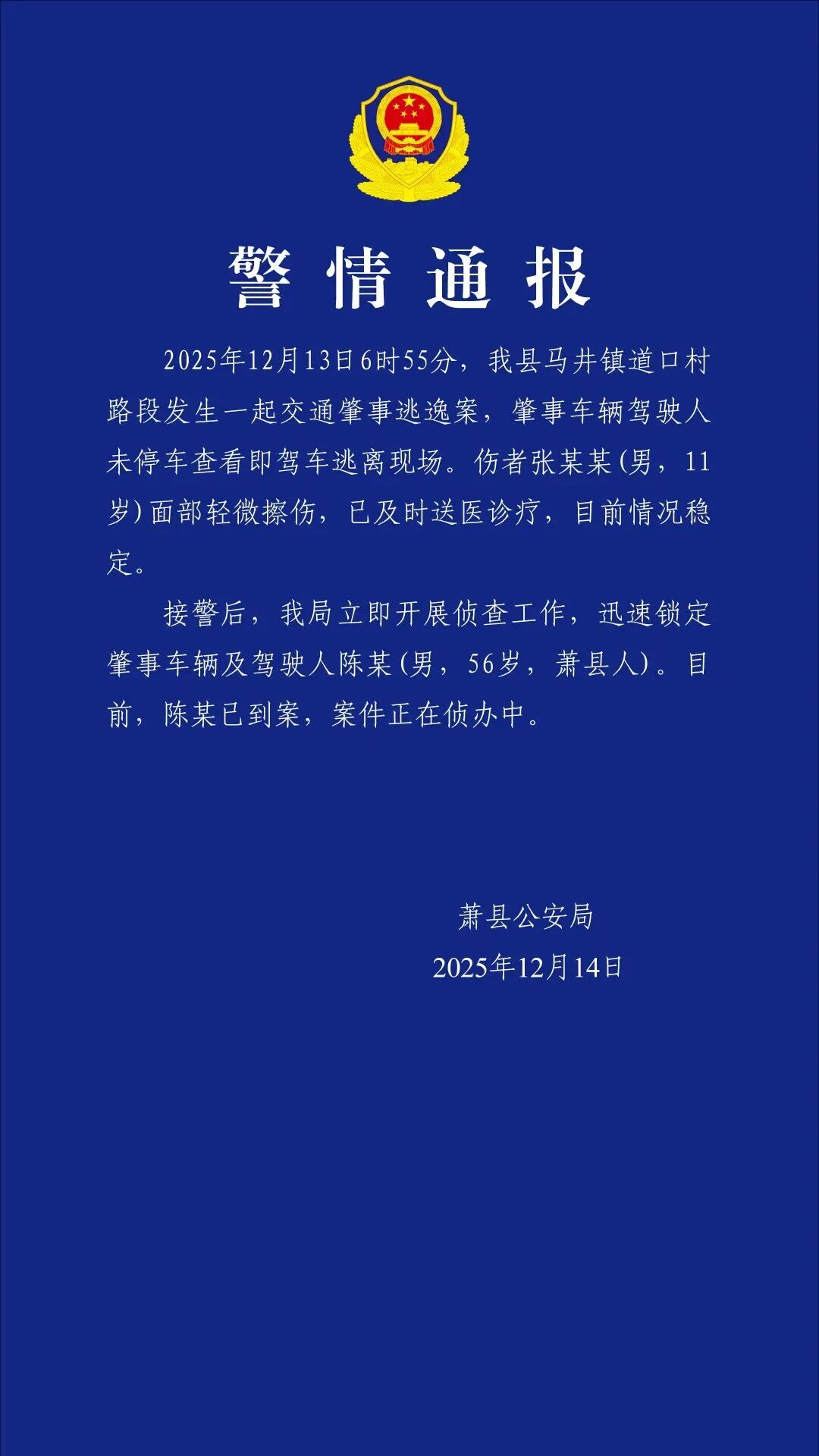 2025年12月13日6時55分,我縣馬井鎮道口村路段發生一起交通肇事逃逸案,肇事車輛駕駛人未停車查看即駕車逃離現場。傷者張某某(男,11歲)面部輕微擦傷,已及時送醫診療,目前情況穩定。