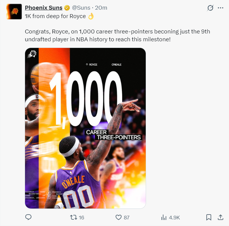 羅伊斯-奧尼爾生涯完成1000+三分里程碑,他成為NBA歷史第九位落選秀達成1000+三分的球員。