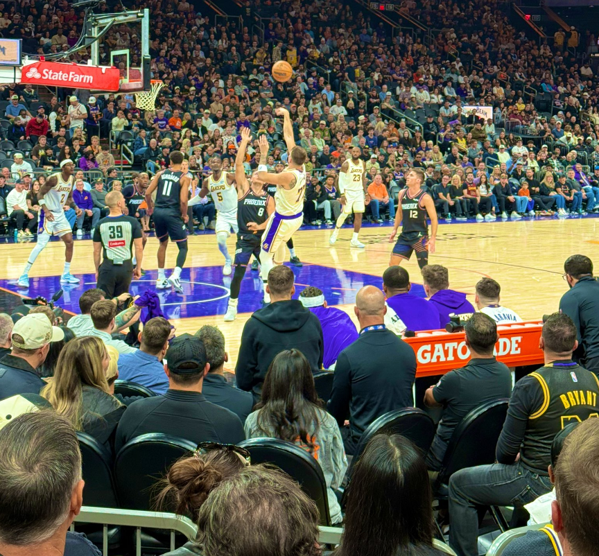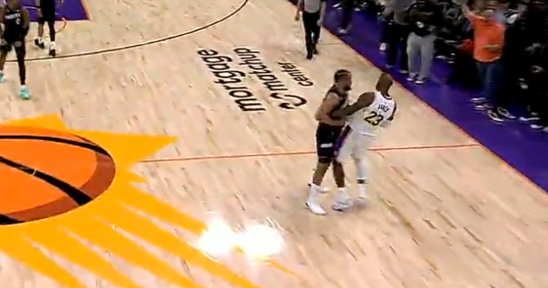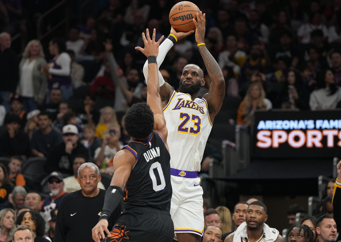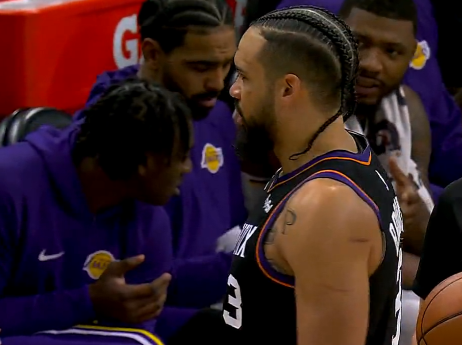 第三節開場狄龍與詹姆斯就產生沖突,狄龍疑似不滿詹姆斯的動作將球砸向老詹,結果裁判給了詹姆斯一個T,詹姆斯非常憤怒。布克三分打鐵,詹姆斯接球沒接穩失誤,詹姆斯翻身跳投單打阿倫還是未能命中,東契奇三分繼續打鐵,湖人三分太鐵了好在伊戈達羅拉人犯規,太陽反擊不中,東契奇打吉萊斯皮造犯規,海斯暴扣2+1反超了,文森特三分準壓哨,太陽五分鐘沒得分被湖人反超九分。