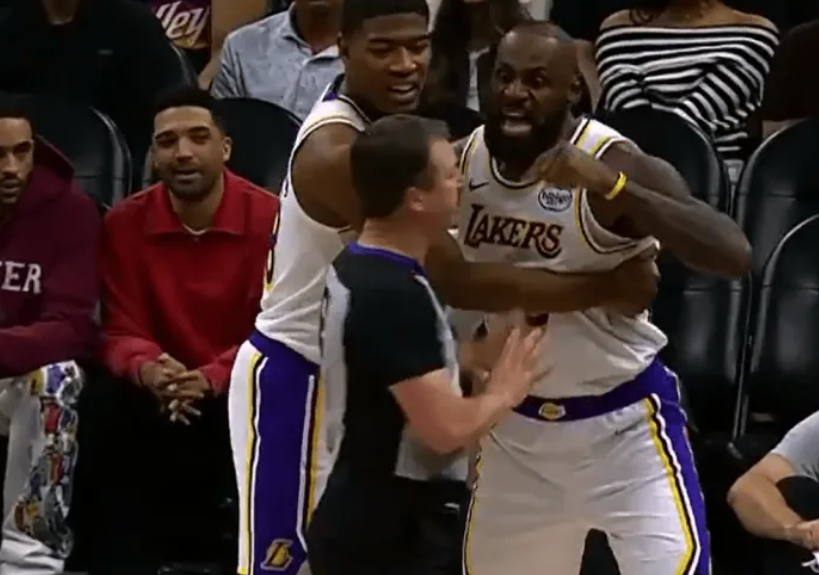 第三節比賽中,狄龍將球扔向詹姆斯,后者憤怒追要說法,裁判吹罰詹姆斯技犯,詹姆斯非常憤怒,八寸壘抱著詹姆斯,感覺老詹第一次想干裁判。