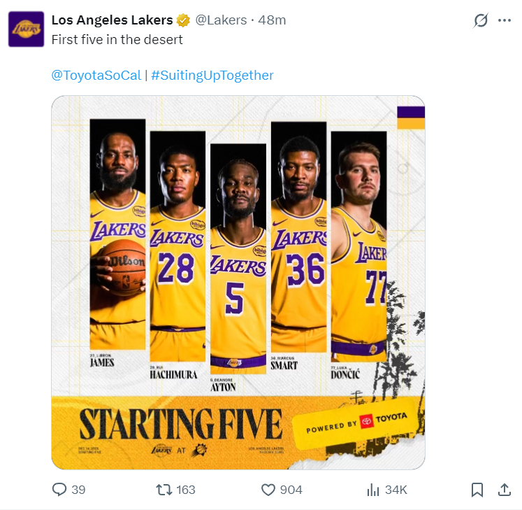 湖人:東契奇、斯瑪特、詹姆斯、八寸壘、艾頓;