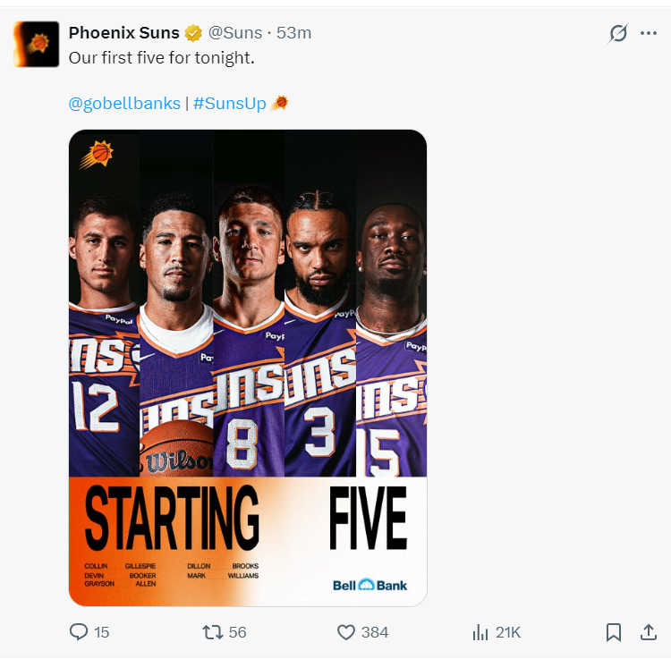 布克傷停了三場比賽后復出,杰倫-格林還在傷病名單上,太陽先發是1大4小。