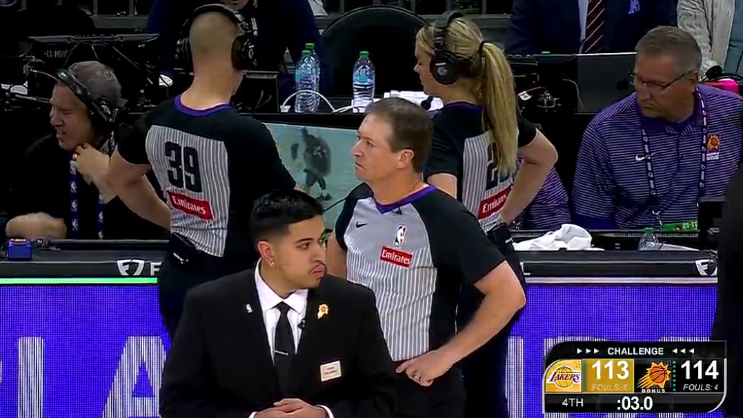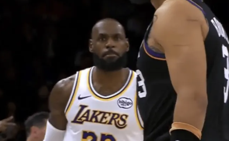 詹姆斯絕平罰球不中,詹姆斯三分出手被布克犯規,裁判看回放太陽挑戰失敗。