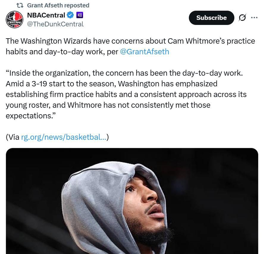 美記Grant Afseth也跟進曝出,相比于肢體語言、防守失誤和投籃選擇這些顯性問題,奇才教練組更加擔憂白魔日常訓練的表現與態度。