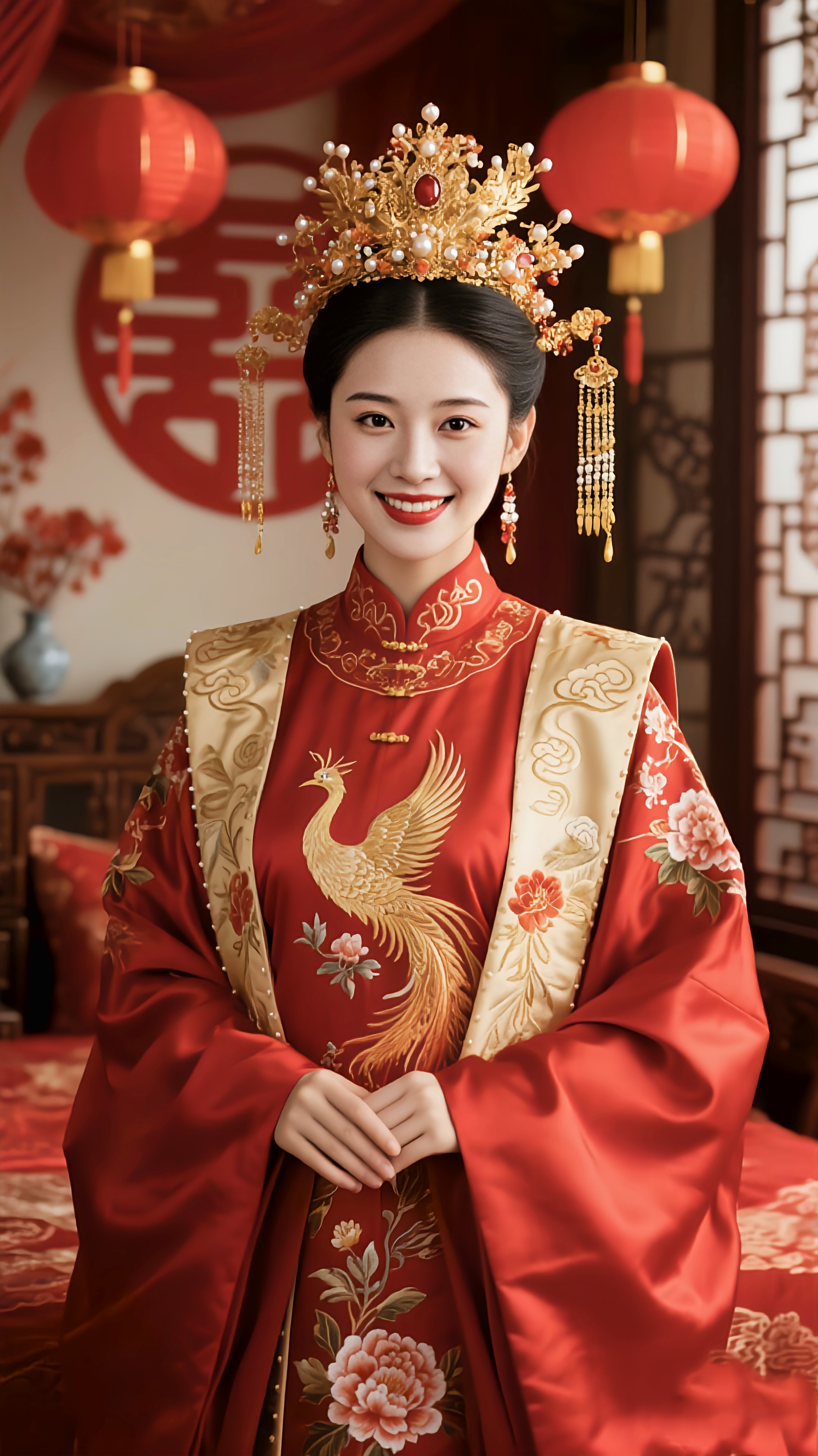 當朱紅的繡線在綢緞上勾勒出金鳳銜枝的紋樣,當鎏金的鳳冠綴滿珍珠與紅寶在鬢邊生輝,一襲中式嫁衣便成了東方婚嫁文化里最濃墨重彩的符號。這組以秀禾服為核心的中式婚嫁寫真,將傳統嫁衣的工藝之美、色彩之韻與文化之魂展現得淋漓盡致,在紅燈籠與紅雙喜的映襯下,勾勒出中式新娘獨有的溫婉與華貴。它不僅是一張定格幸福的寫真,更是對中式婚嫁美學的生動詮釋,讓藏在針腳與紋樣里的東方浪漫,在當下依舊綻放著動人的光彩。